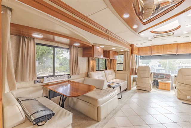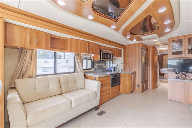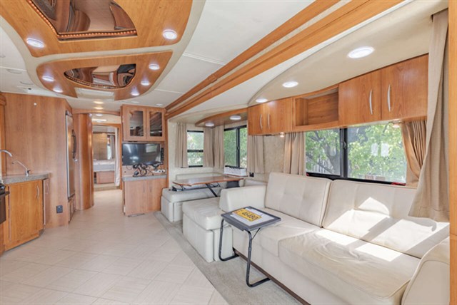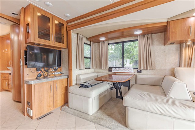 The breathtaking living area features an overhead lighting tray, a creme-colored leather sleeper sofa, a love seat, a dinette that converts to a sleeper, and a flat-screen TV. The solid wood cabinets are gorgeous.