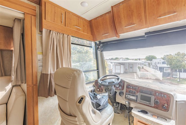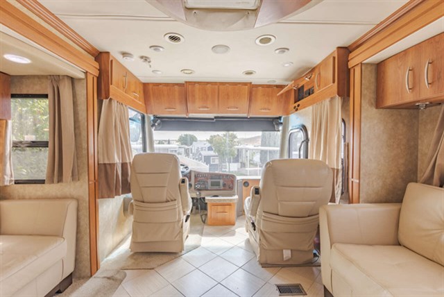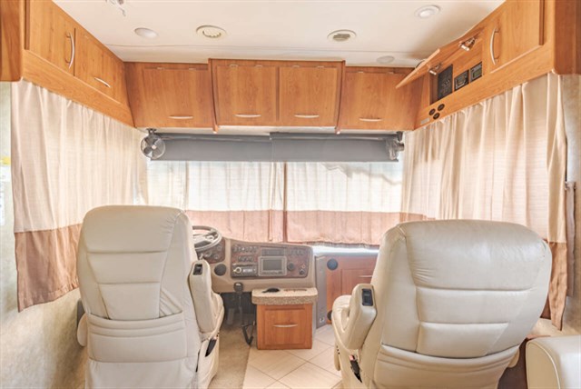 Entering through the side door with an awning, you'll be impressed with the super wide and comfortable Flex Steel leather seats for the passenger and the driver, and they rotate.