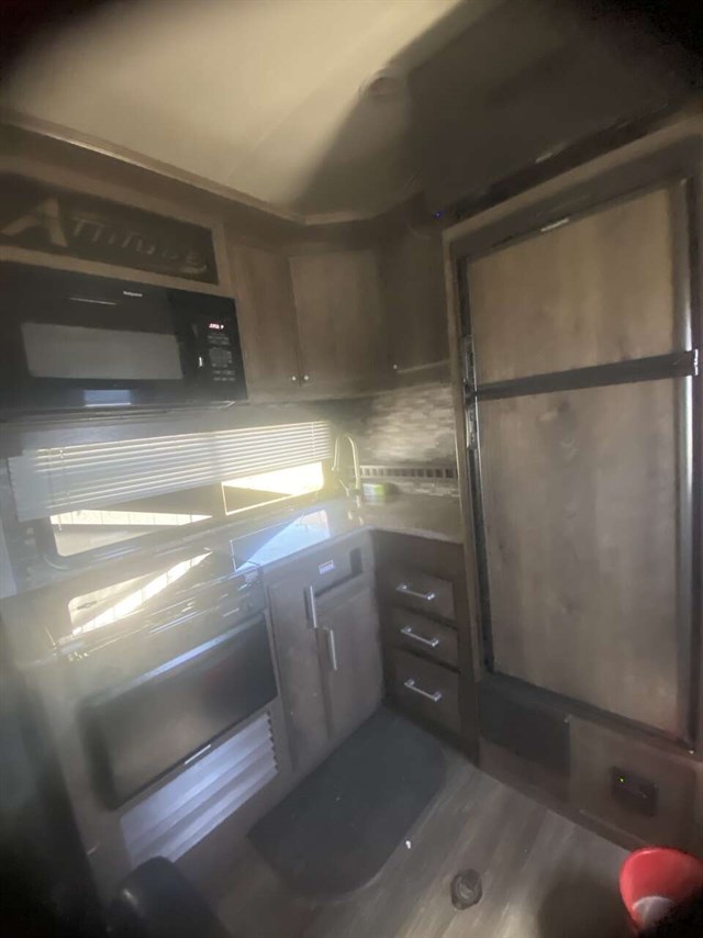 With 12'4" of roadside cargo space and 16'5" of curbside space you can easily load up your off-road toys and head out to the campground of your choice with this Attitude Wide Lite 28SAG toy hauler travel trailer. After your gear is unloaded then you can lower the electric bed. In the evening plan to sit for a while and visit at the sofa or the two lounge chairs. If you prefer a bit more floor space then you may want to add the optional slide out. Meal prep is easy in this kitchen, and at night head up the stairs to the private front bedroom where you will find a queen bed and plenty of storage with the wardrobes and overhead cabinet, plus more!