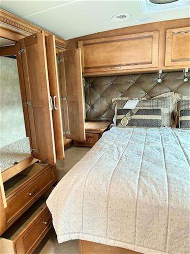 There is a folding door that closes off the bedroom space for more privacy. Here you will enjoy sleeping on a 60" x 75" queen size bed with dual nightstands, plus a slide out wardrobe area including drawers. A nice TV location is along the outer toilet area wall where you will enjoy a 22" DC HDTV.