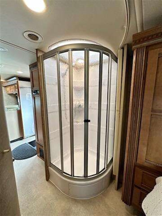 Head toward the rear of the coach and walk-through the bathroom area with corner shower on your left and private toilet area and vanity with sink on your right.