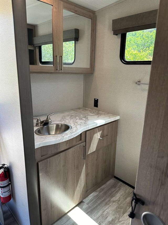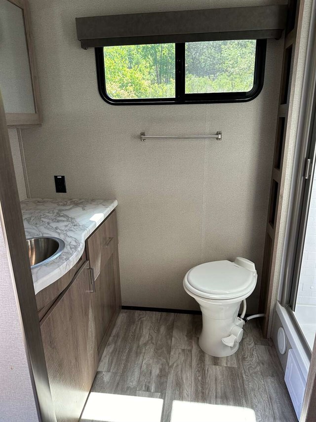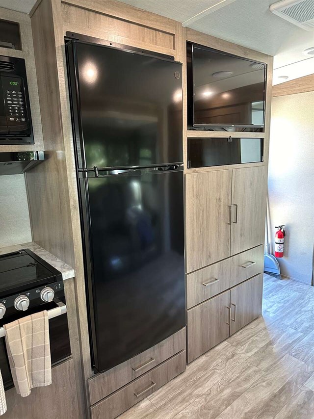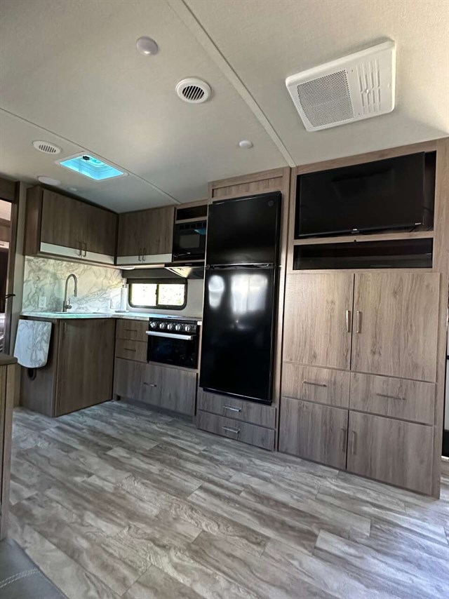 This pet friendly travel trailer includes a pet dish under the double door refrigerator for food and water so you don't have to leave anyone behind when you head out to the campsite. The spacious rear bath includes a shower with a skylight giving you more head room and natural lighting as well as a space saving door for privacy. You can easily enter the trailer using the StepAbove aluminum steps, place your sandals in the shoe storage and quickly get to the bathroom and back outside to enjoy the weather. The 21' power adjustable awning offers a great place to relax that is protected from the sun, and the pass through storage gives you ample space for charcoal, camp chairs and even fishing poles. Back inside you can make meals at the L-shaped kitchen, watch the LED HDTV that will adjust to the perfect view, and dine at the U-shaped dinette or tri-fold sofa. And your master suite has everything you will need to sleep comfortably.