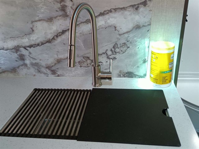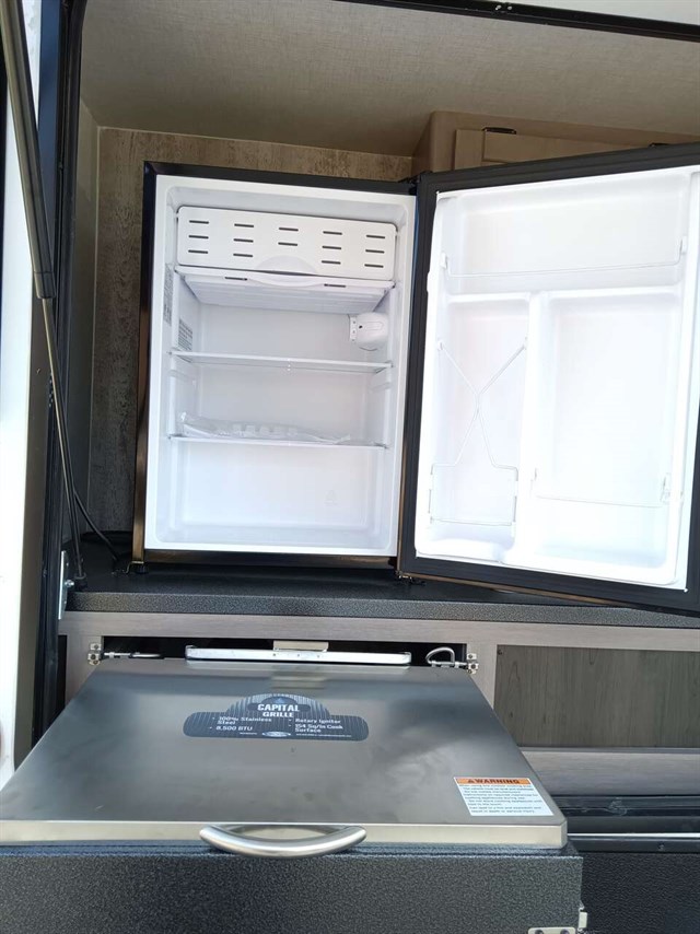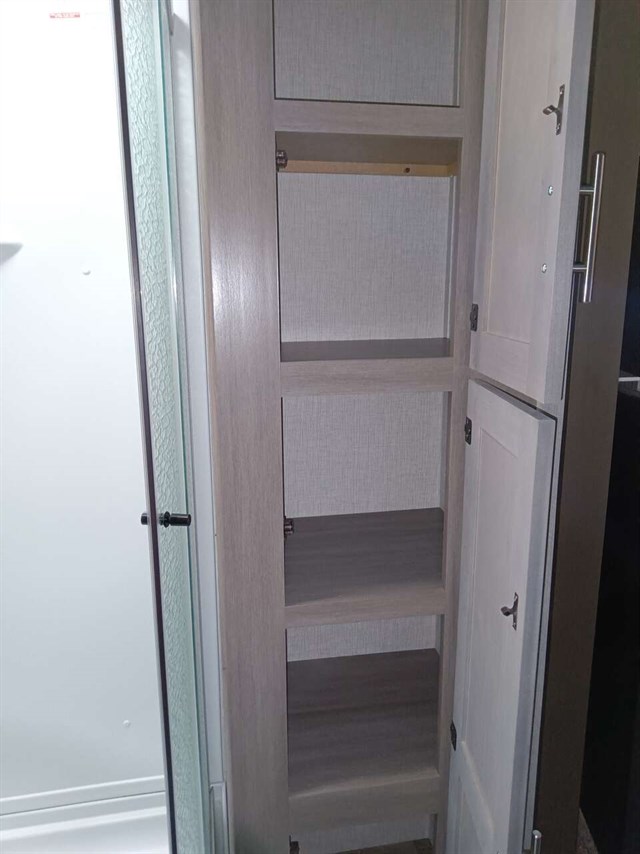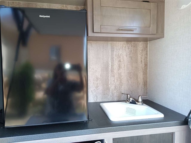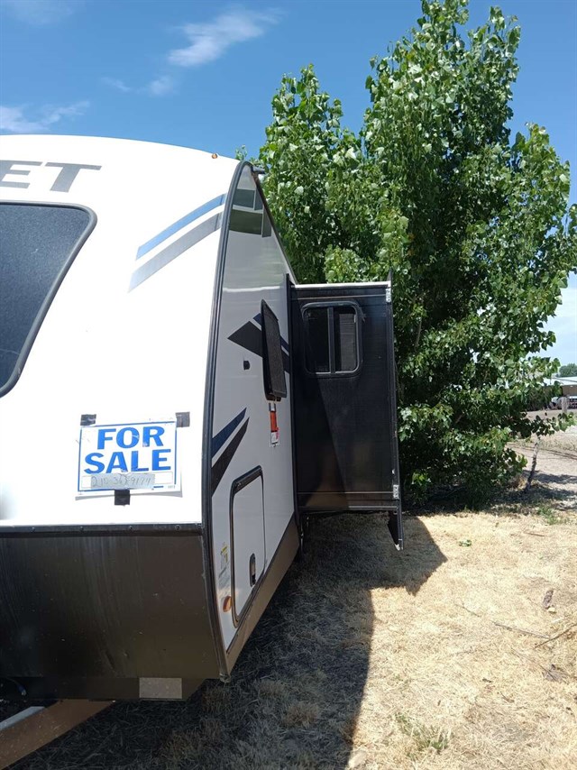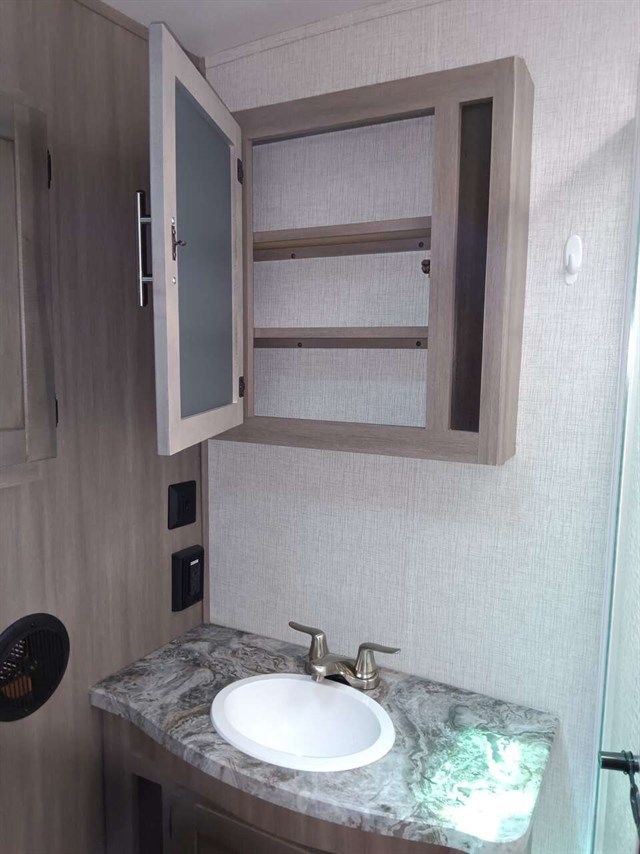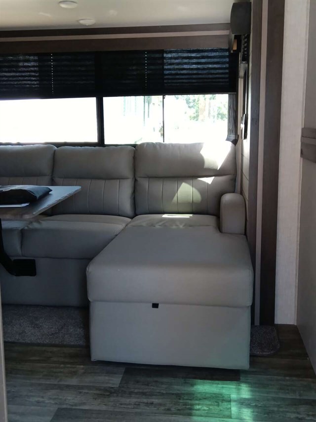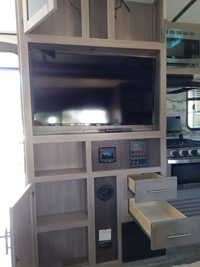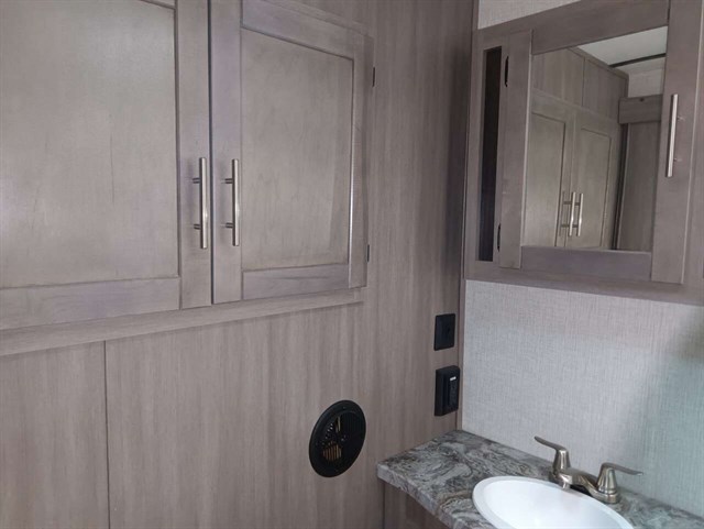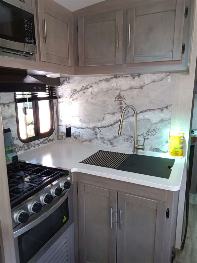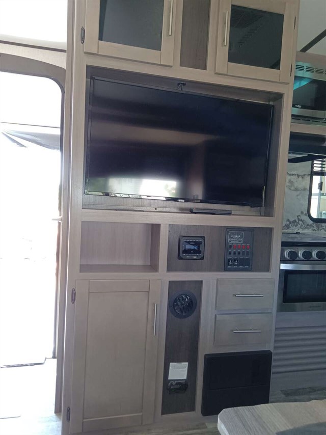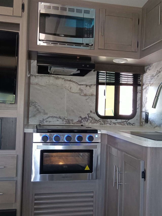 This RV was used only 5 times & didn't go far from home & wintered indoors.Bought it in late '22 new. Camping will be so much fun in this comfy like new RV. It has a king size bed & a queen pullout bed plus it is WIFI ready. Enjoy cooking in you're outdoor kitchen with a fridge, sink, cabinet & cooktop. Giant TV in living area & connections for DVD, CD players & more. Lots of storage areas (inside & outside) for all you're needs. Has Solid Step System for added stability. Has a walk in pantry with 3 deep shelves. Large fridge & spacious freezer. Oven never used. Microwave never used. There is even space for your pet under the king bed. We are seniors so there was never any kids or pets in it. It also has a stabilizer bar to avoid RV from swaying