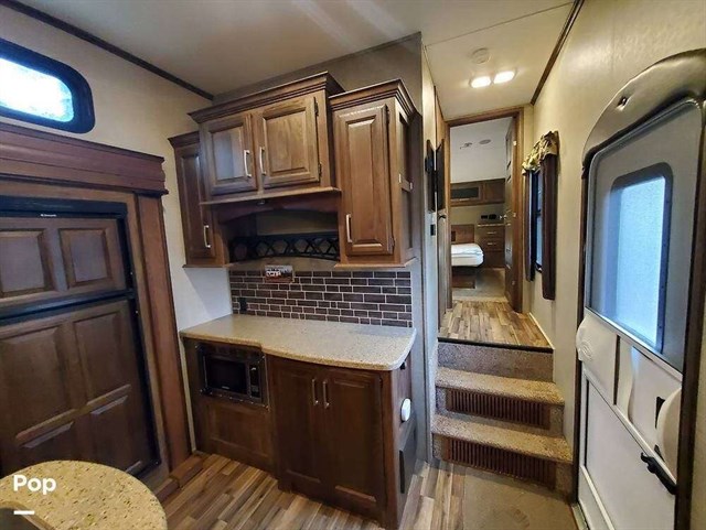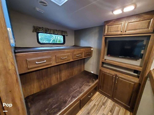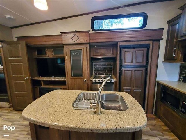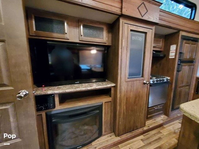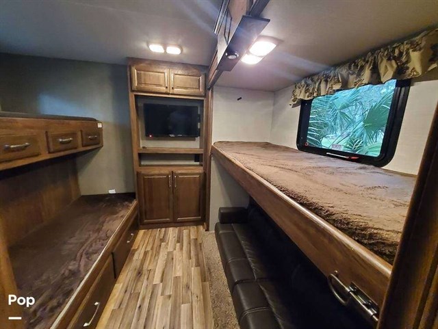 38' overall length sleeps 11, 3 x 300 watt solar panels with 2 x 12v interstate batteries, 4 x power slide outs (with remote control), power auto-leveling jacks, 2 sets of bunk beds in seperate room with a 32" tv, recliner chairs, bench seating at the table that makes down into an extra bed. Fireplace, 40" living room tv, ac, furnace, Recliners in living room, gas/electric 6 gallon water heater, large fridge and pantry, queen size bed with lots of storage in main bedroom, full width storage outside underneath. 1x13,500btu A/C unit, 30,000 btu large heater, 4 seasons insulated.