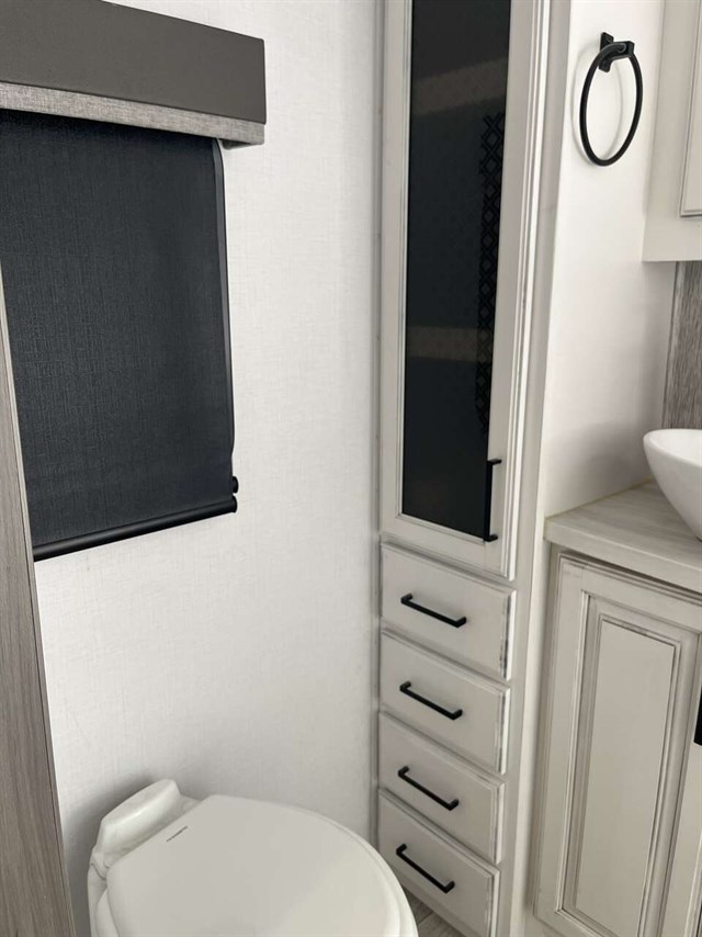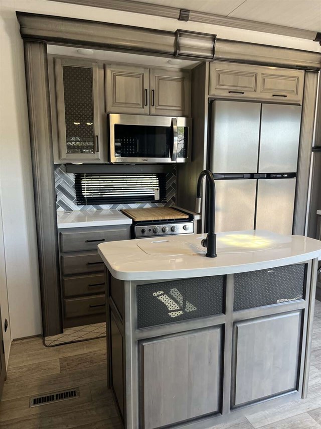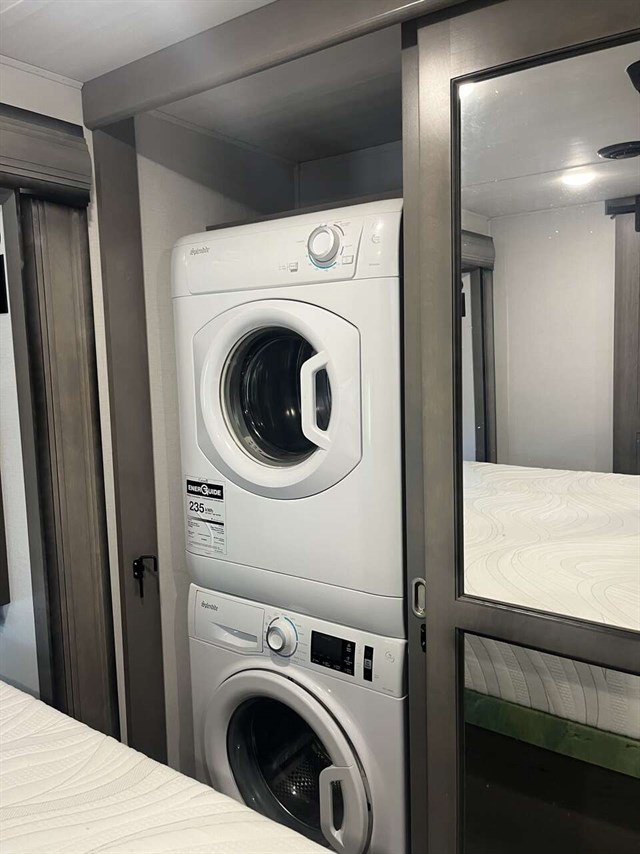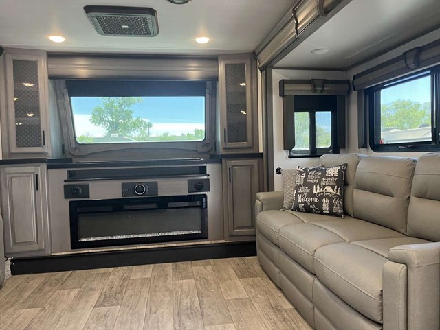 Enhancing the overall experience, the RV boasts plenty of exterior storage, providing ample space for your belongings. A privacy screen adds an extra layer of comfort and versatility to the living space. Soft close cabinets throughout, crown molding, central vacuum with attachments and an electric fireplace contribute to the elegant look of the RV. Enjoy the practicality of a propane/electric full size refrigerator and a kitchen island for added functionality with LED accent lighting. Tinted windows with double shades. It also has a solar flex system and an extra battery for storing the energy from the solar.