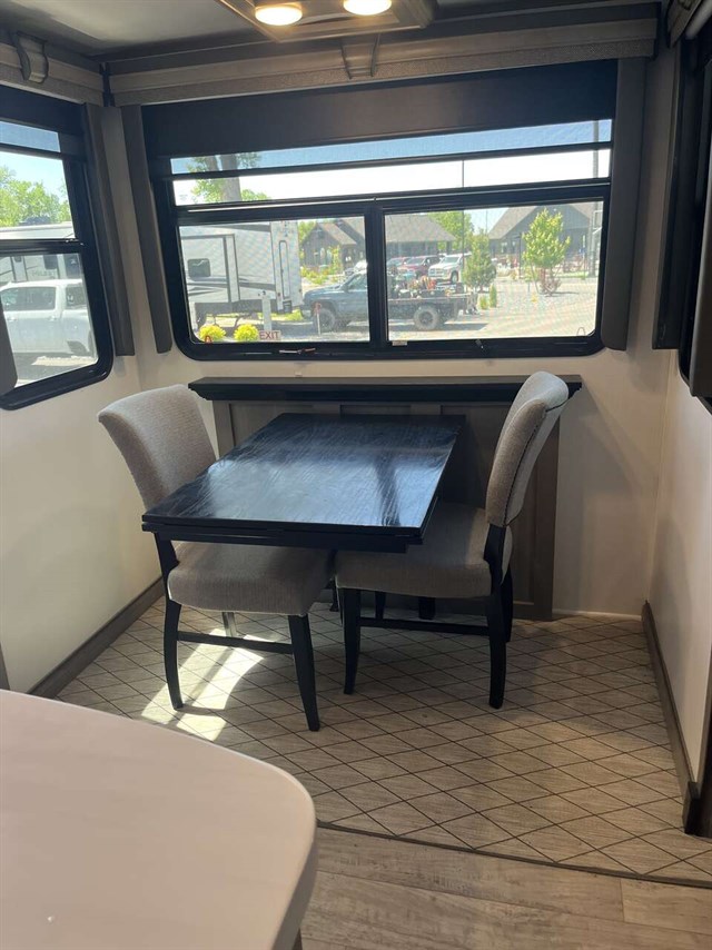 In LIKE-NEW condition, this Keystone Montana reflects meticulous maintenance. With two Smart TVs, a JBL Subwoofer, and an electric fireplace that changes colors, experience entertainment on the road while enjoying the roominess of a thoughtfully laid-out living space. Notably, it features one full master bath with skylight over the shower, one half bath off kitchen, free-standing 4 seat dinette and an installed stacked washer and dryer, adding to the convenience of all your travel needs.