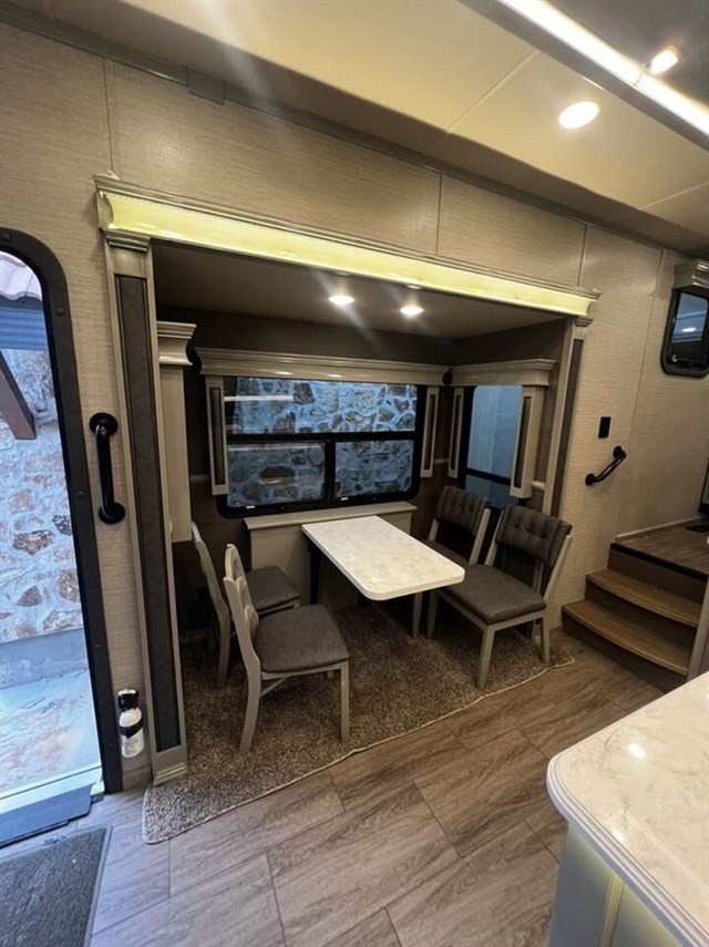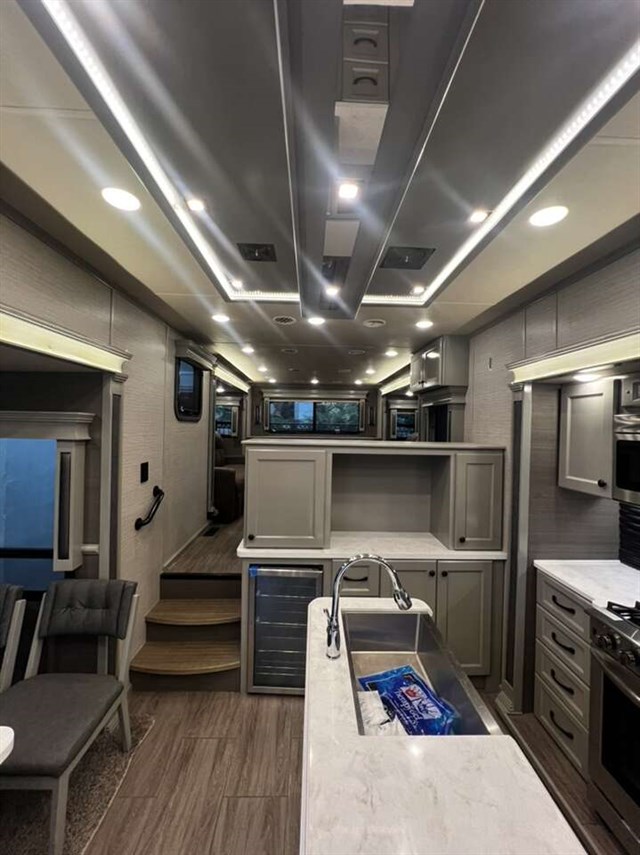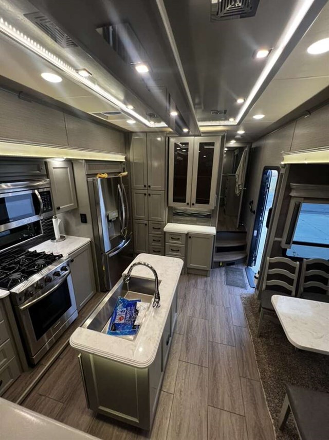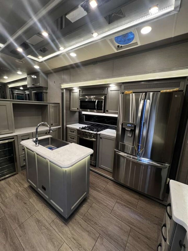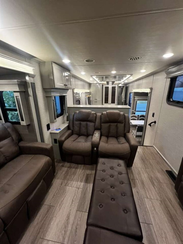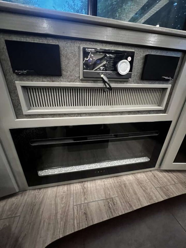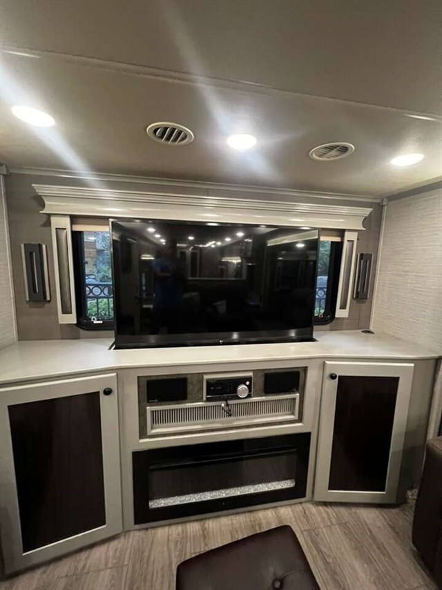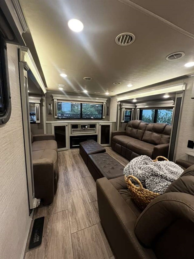 This fifth wheel is perfect for your weekend excursions or full-time living. Make yourselves comfortable in the rear living area that includes two tri-fold sofas, a theater sofa, plus an entertainment center with a 55" TV and 40" fireplace. This area can double as your guests bedroom at night, and you and your spouse will enjoy the front private bedroom all to yourselves. The slide out king bed will provide a great night's rest, and you can neatly hang your clothes in the large front closet. Preparing meals each day will be a breeze in this Beacon kitchen that includes an Insignia residential style oven, a kitchen island with a farm sink, plus two hutch's for storage space galore. There is also a hand-built pantry to store all your dry goods, and a wine fridge to entertain guests!