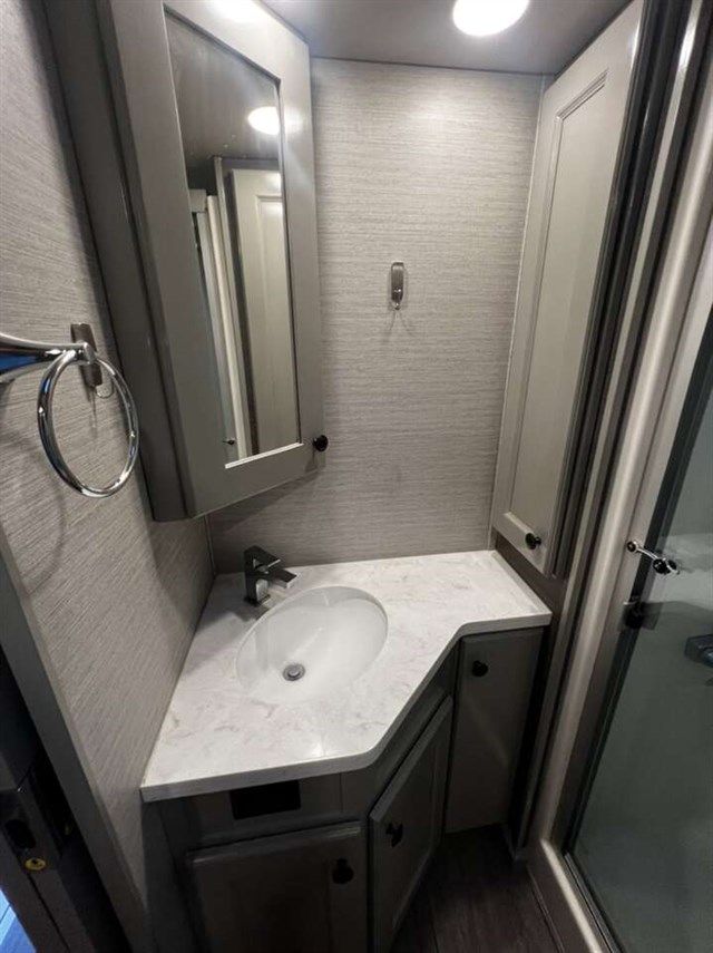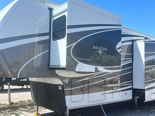 Each Beacon fifth wheel by VanLeigh RV is made with your comfort in mind. From the high-quality Franklin furniture, made in the U.S.A, to the Memory Foam mattress, it's easy to find luxury features at every turn. There are solid surface countertops in each model, along with a stainless steel farm sink, updated cabinetry design, plus new flooring you are sure to love. You will love the sleek look of the full overlay hardwood cabinetry and faceferames, the hand laid vinyl tile flooring, and the updated ceiling treatment. Plan to travel year around with the Whisper Quiet A/C system, the BTU furnace, and the 7,200 BTU electric fireplace, plus each model is constructed with a fully enclosed and heated underbelly with heat return. The outside of the Beacon features two patio awnings, a 2" receiver hitch, new Lippert On-The-Go ladder prep, and the list goes on!