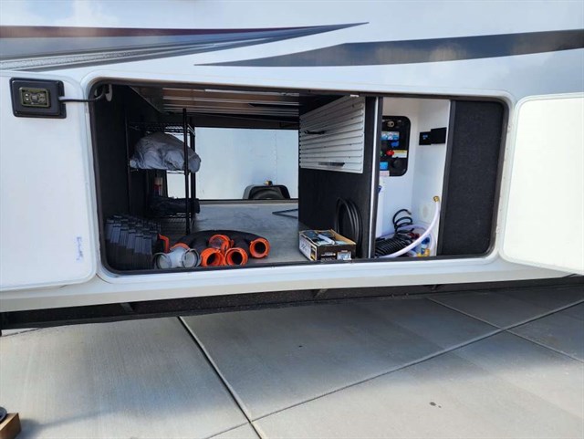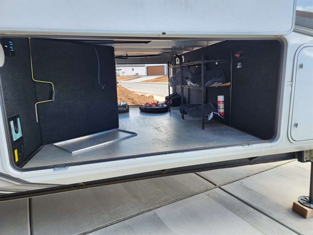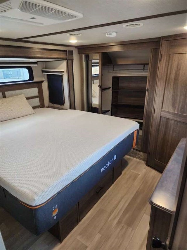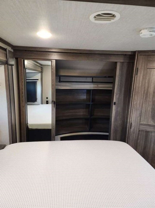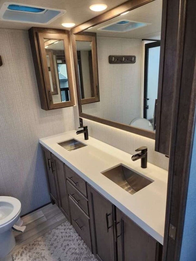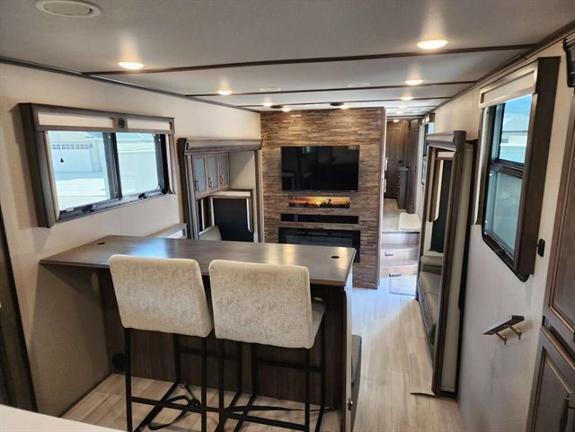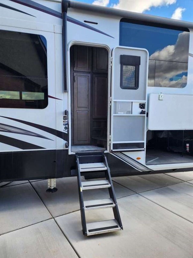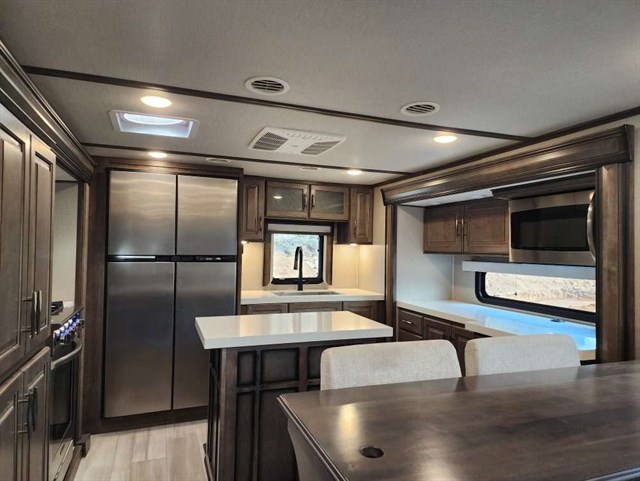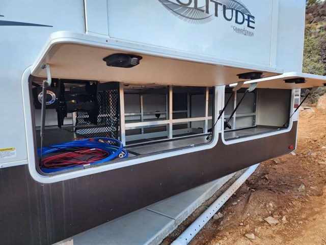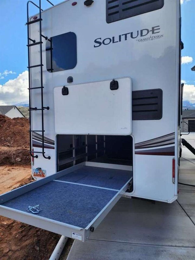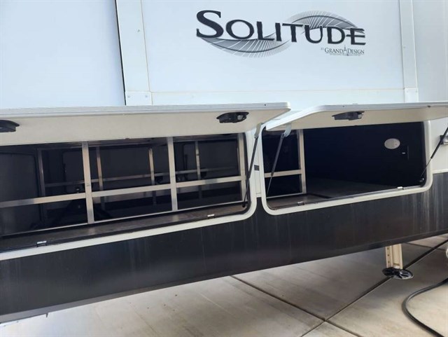 You will love your extended stays while traveling in this Solitude fifth wheel which features five slides! A rear raised kitchen provides the family chef a great space with opposing slides as well as an island for food prep. A raised bar top with two stools overlooks the center living space that also features dual opposing slides, two tri-fold sofas, and theatre seating. Dual sinks in the full bathroom means getting ready is easy for two, and the shower with skylight offers more head room that you are also sure to appreciate. As you wind down your day, the front master bedroom will be a welcomed retreat thanks to a queen bed slide, and the walk-in closet provides ample space for all of your things. For added storage, a large exterior sliding tray offers more room for luggage and larger items. There is also a mid-coach pass-through storage compartment for other camping gear.