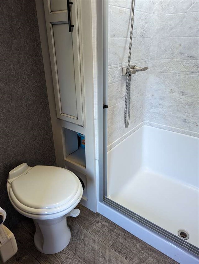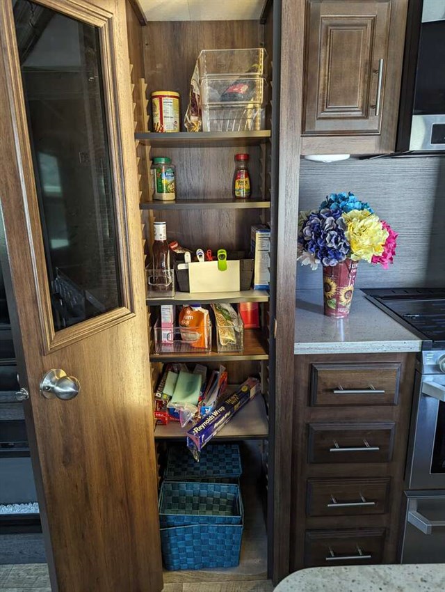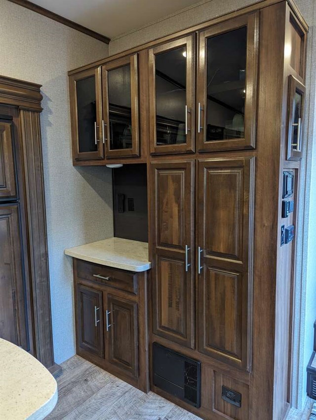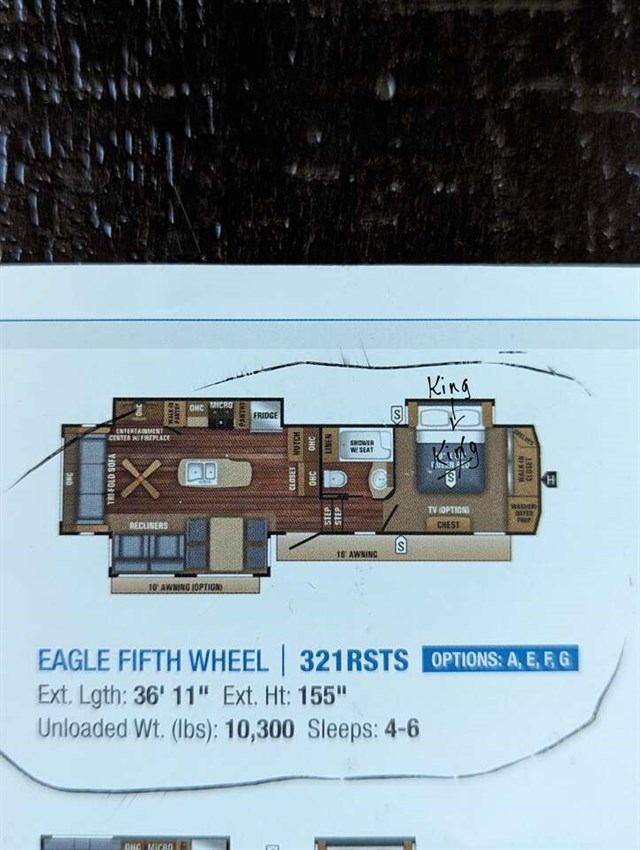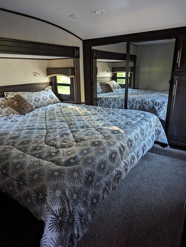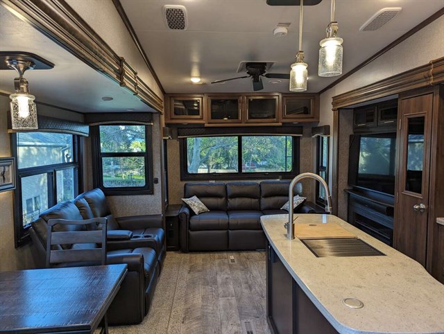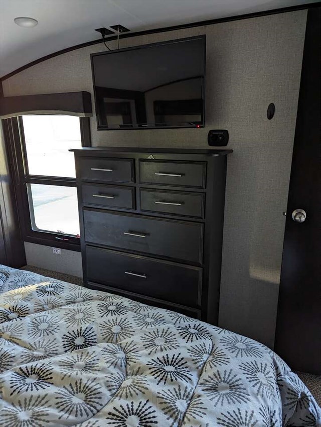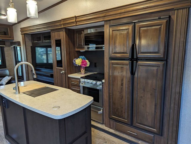 If you only like to travel in luxury, take a step inside this Eagle fifth wheel to find what you have been looking for. From its completely elegant kitchen with a residential walk-in pantry, a large island with a stainless steel under-mounted sink, a roll-up metal strainer, and a bamboo cutting board, to its peacefully accommodating private bedroom with a slide out king bed, and a large closet, this unit is packed out with all of the features you could possibly need. There has even been a space prepped to add a washer and dryer if you choose!