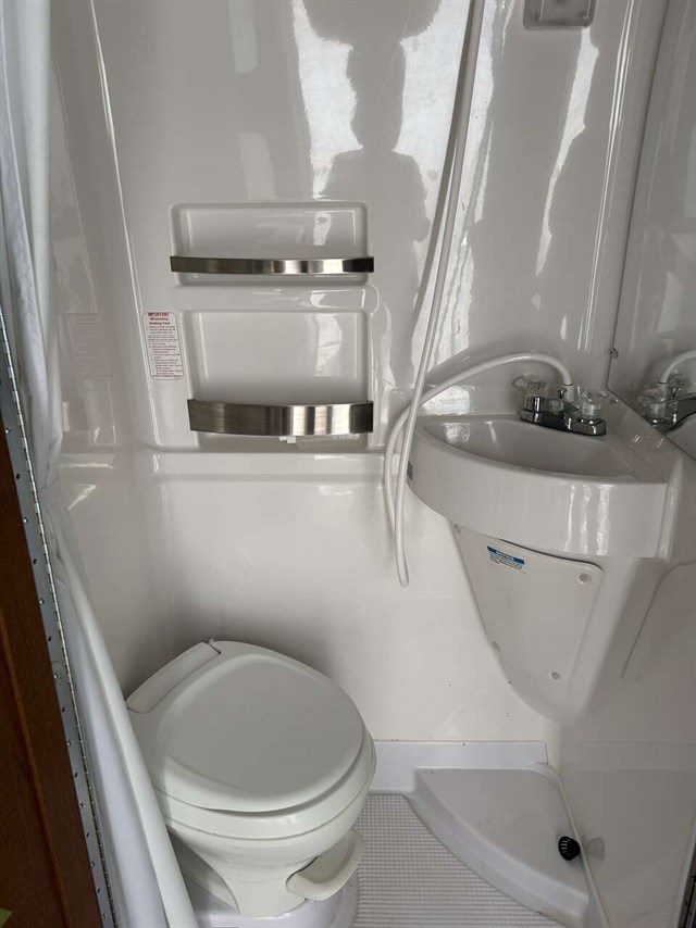 Galley features a 5.3 cu.ft. refrigerator, propane stove, microwave and flip up counter extension with charging station