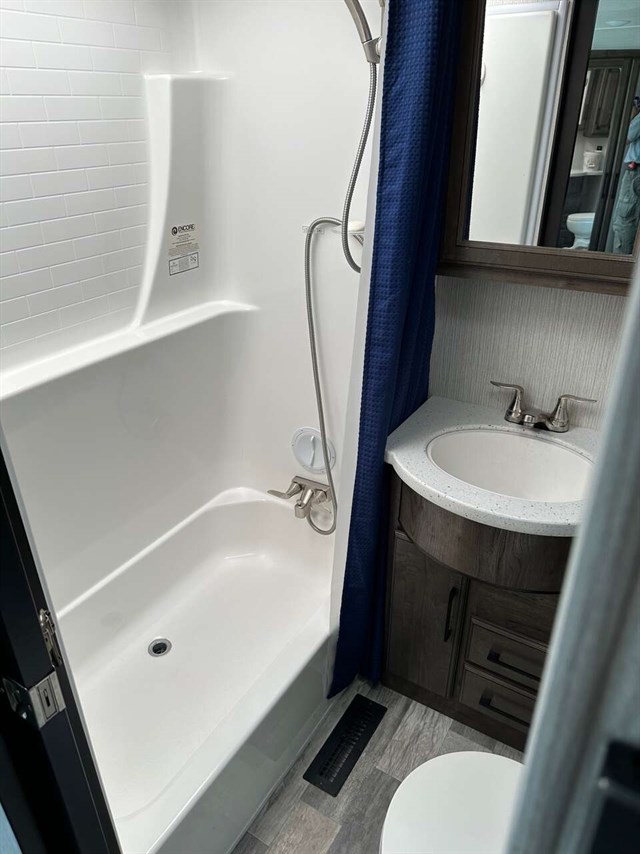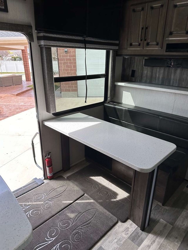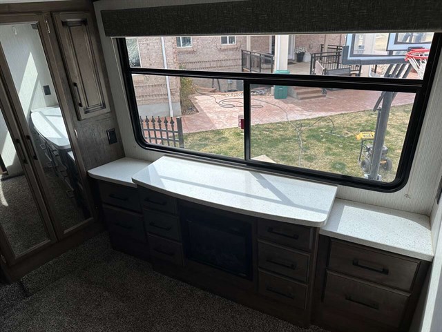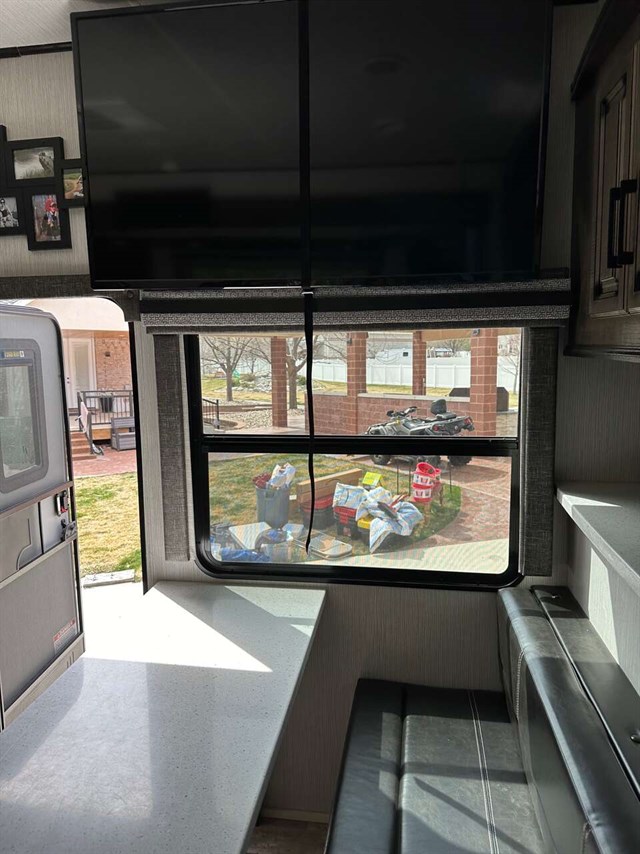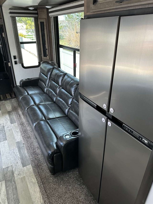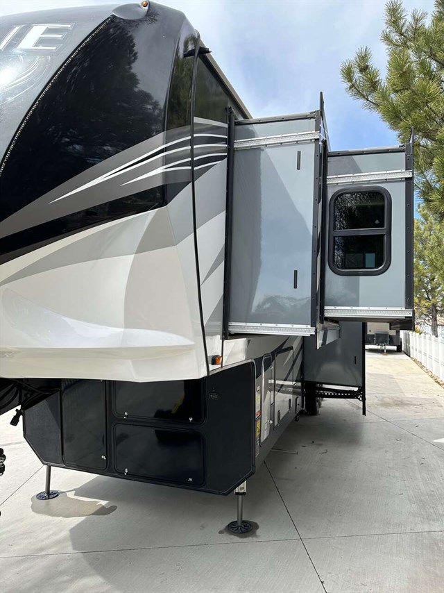 I am the original owner and have the title. Triple slide 44 foot triple axle fifth wheel toy hauler always stored indoors in climate contolled garage. Has many extra's such as Xzilon 7 year Paint and Fiberglass, Fabric and Vinyl /Leather protector, Is Solar Ready, Has Canadian Arctic Package with Weather Guard optimal thermal protection. Generator has 36 hours on it, most of those while performing maintenance. From a fireplace in the Master bedroom for those romantic get aways, to a king size bed for a comfortable nights rest, a large shower, my wife and I have loved this floor plan. It has a spacious kitchen with oven, microwave and Large fridge. This unit has 4 TV's, an outside kitchen, a 13 foot garage with a second half bathroom. The back door opens to a deck with it's own railing or can be used as a ramp. It also has two queen size beds that lower from the ceiling. Large water tank, two grey and two black tanks. There are washer and dryer hook up's. This is an amazing unit that can comfortably accomodate a large family or group. We are selling it because we have hardly used this unit, been to busy with other commitments. Is very stable being towed, tires are in great shape, still has the smell of a new trailer.
