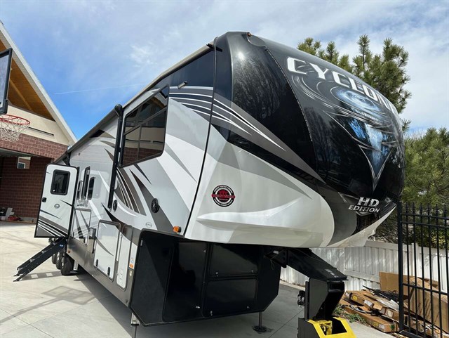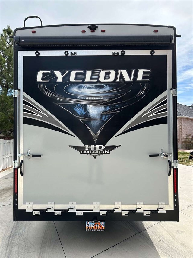 Get ready to let the fun continue all weekend long with this triple slide out Cyclone 4007 toy hauler fifth wheel. The 13' garage features enough room for an ATV or several dirt bikes. With the handy half bathroom in the garage you can easily clean up without walking through the whole fifth wheel. The loft features additional sleeping space as well as the sofa, the electric bed in the garage, and the king bed in the private front bedroom. Also in the bedroom you can relax while warming up in front of the fireplace. When it comes time for dinner then you can decide whether you want to prepare your meal inside or at the outside kitchen. Go ahead and make the easy decision - come enjoy plenty of fun for your family when you choose to camp with this Cyclone toy hauler!