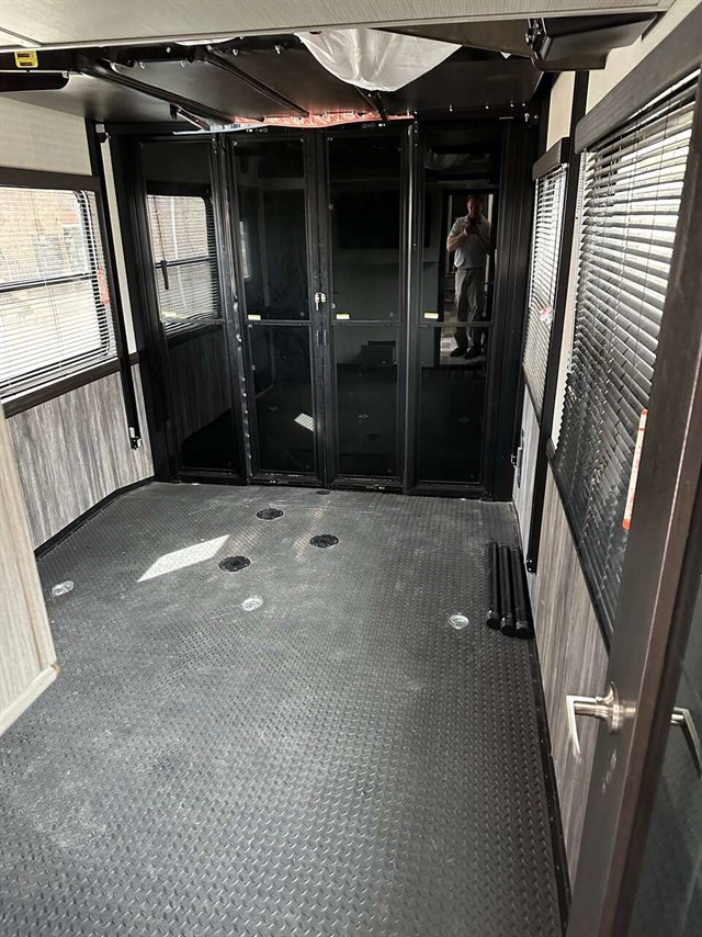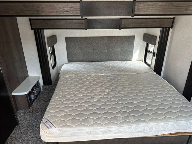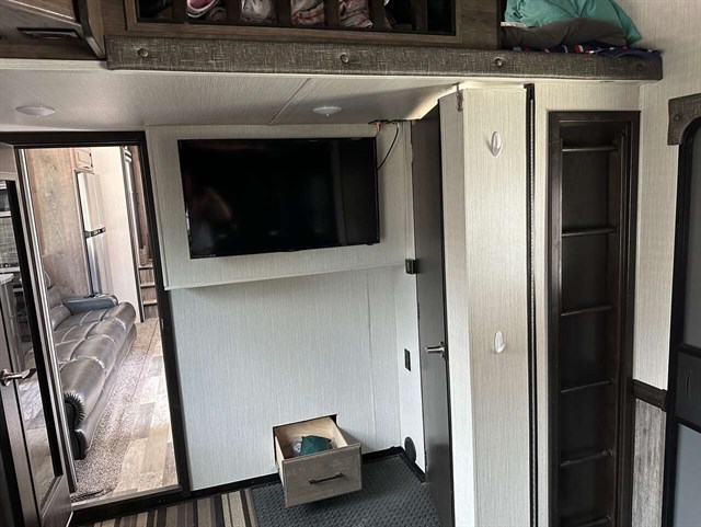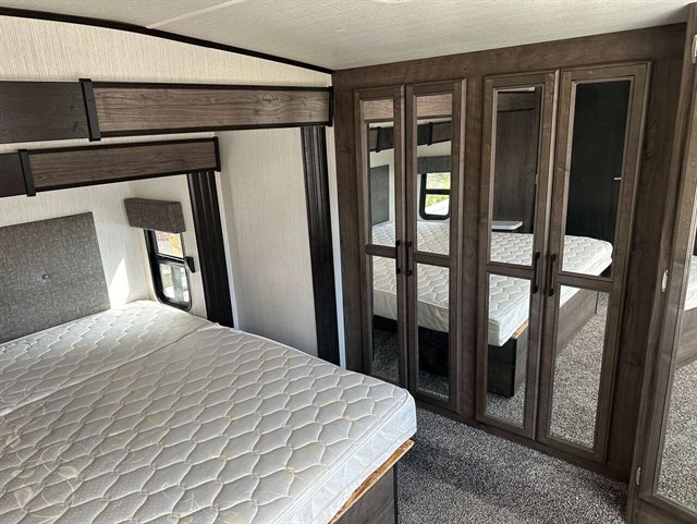 The Cyclone toy hauler fifth wheels by Heartland RV are not your ordinary toy hauler. These models have beautiful cabinets and plenty of comforts throughout such as high quality residential furniture, a 55” LCD HDTV flat screen TV, cable TV and satellite hook-ups, plus a separate DVD/CD/MP3 Bluetooth stereo for the garage and exterior. Along the exterior there are stunning graphics and you will enjoy the view out of the large bedroom picture windows. The two side awnings with LED lights provide plenty of shade during the day, and at night you can grab a snack, your camp chair, and enjoy visiting outdoors just a bit longer. The ultra-light ramp door allows you to easily load your off road toys. In the garage you will also find an electric rear screen, decorative chair rail, plus built-in overhead cabinets with an entertainment center and more!