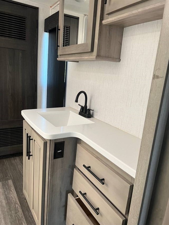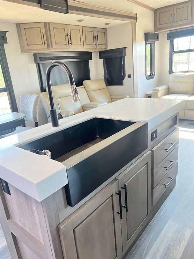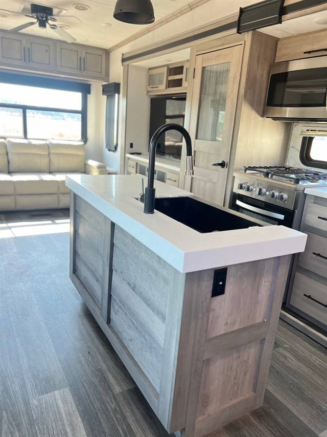 Get ready to enjoy the country with a Big Country fifth wheel by Heartland. These models have a heated and enclosed underbelly which allows you to camp in all types of weather. Also along the exterior, you will find large storage areas, exterior speakers, a light at the entry step, plus a six-point hydraulic level-up auto leveling system. Inside there are stained hardwood cabinets, plus a deep stainless steel kitchen sink. The living room features night shades throughout to provide you the most privacy, plus there is a high-output entertainment system.