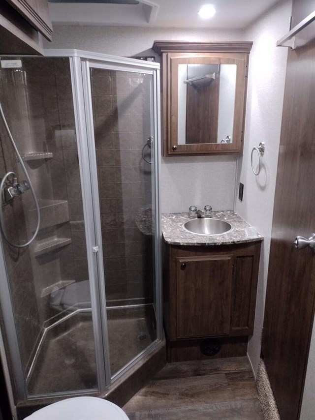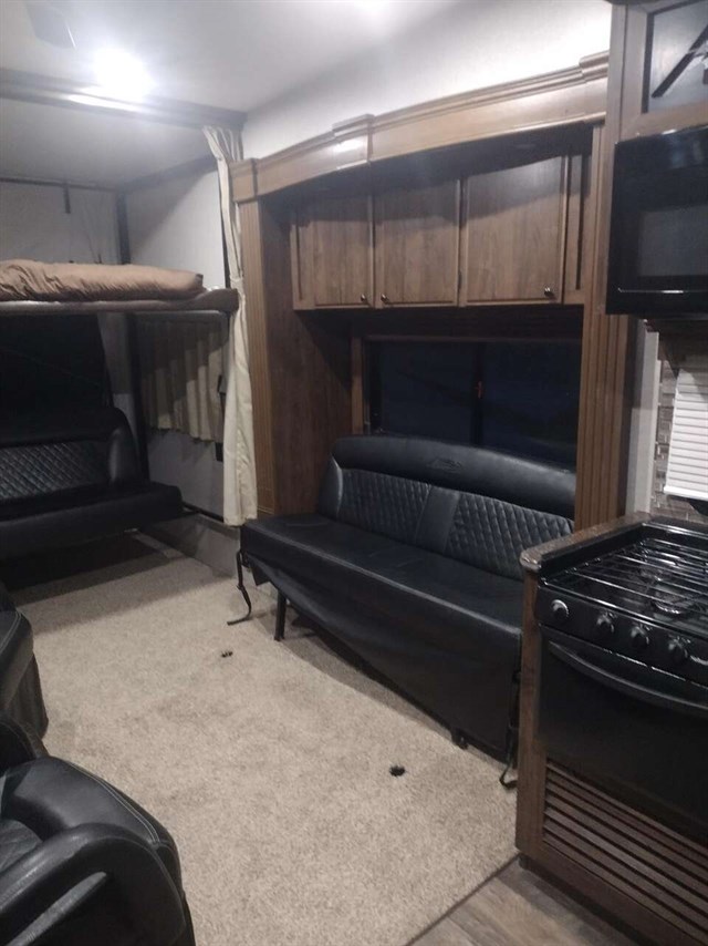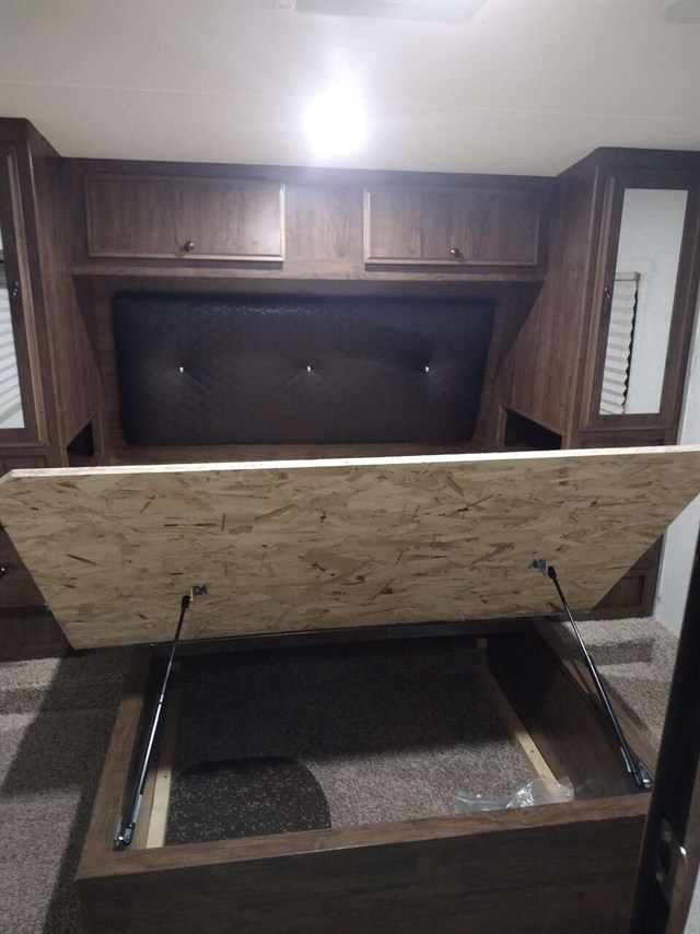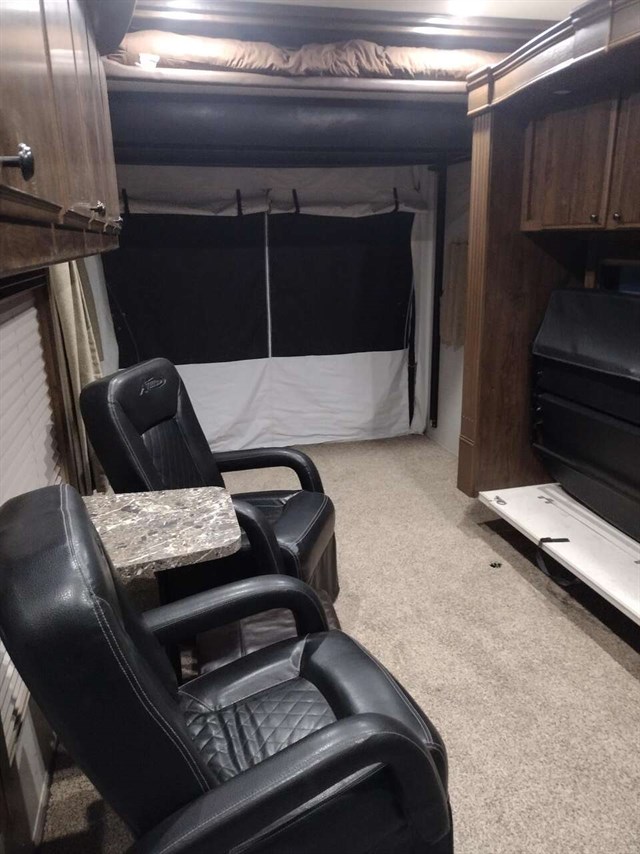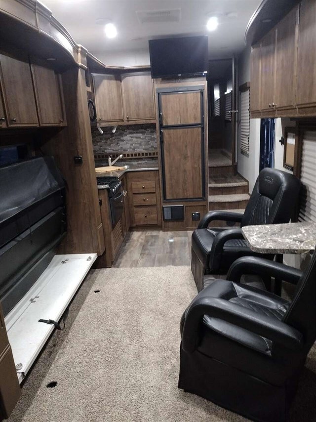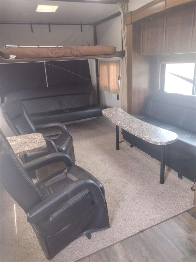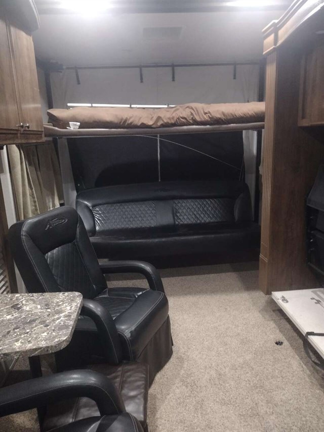 With 12'4" of roadside cargo space and 16'5" of curbside space you can easily load up your off-road toys and head out to the campground of your choice with this Attitude Wide Lite 28SAG toy hauler travel trailer. After your gear is unloaded then you can lower the electric bed. In the evening plan to sit for a while and visit at the sofa or on the two lounge chairs. Meal prep is easy in this kitchen, and at night head up the stairs to the private front bedroom where you will find a queen bed and plenty of storage with the wardrobes and overhead cabinet.