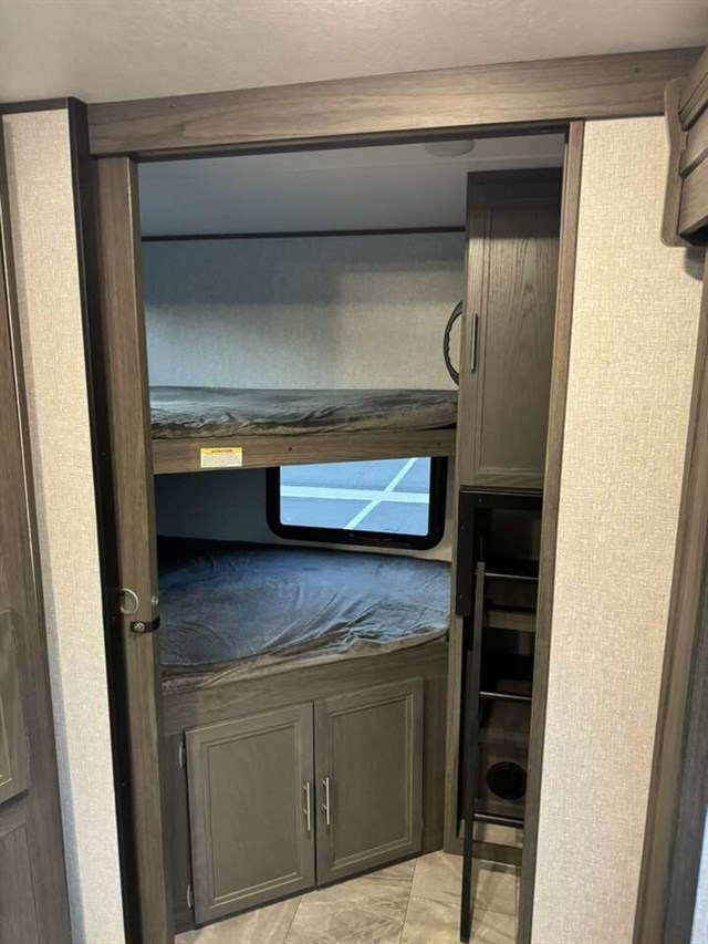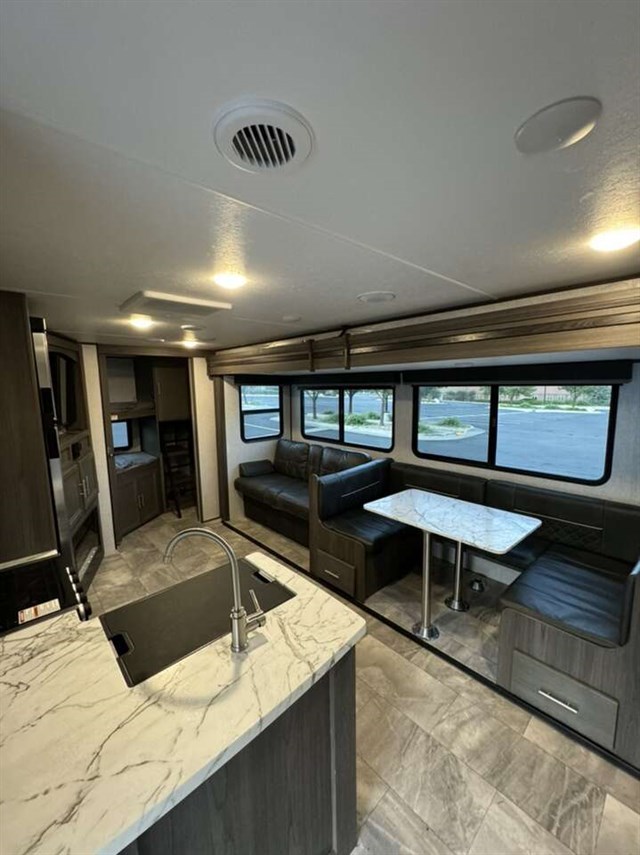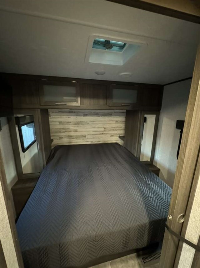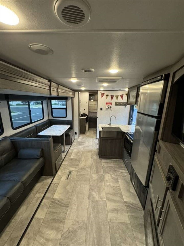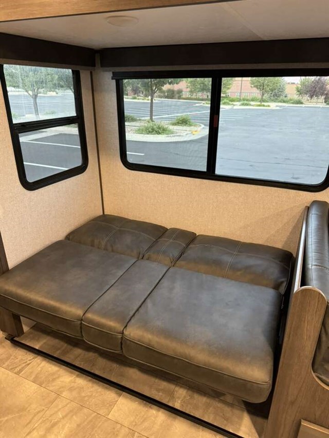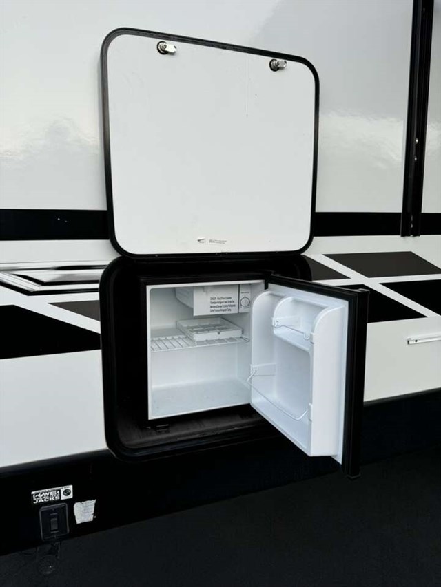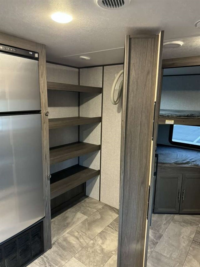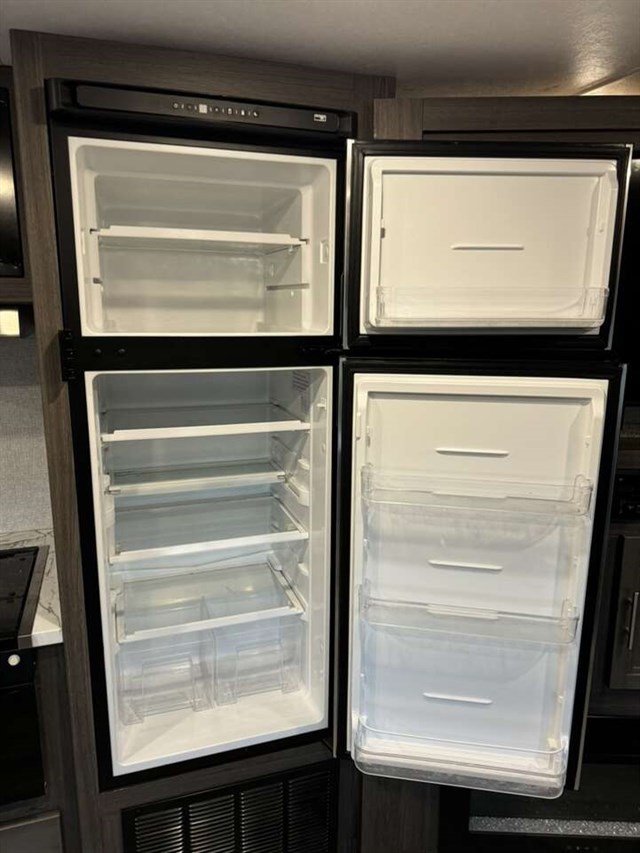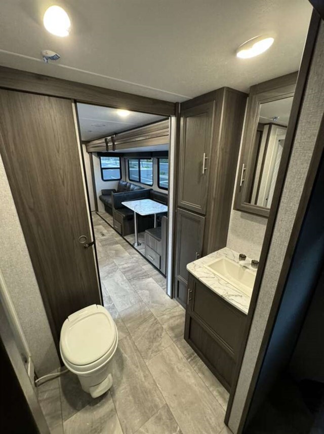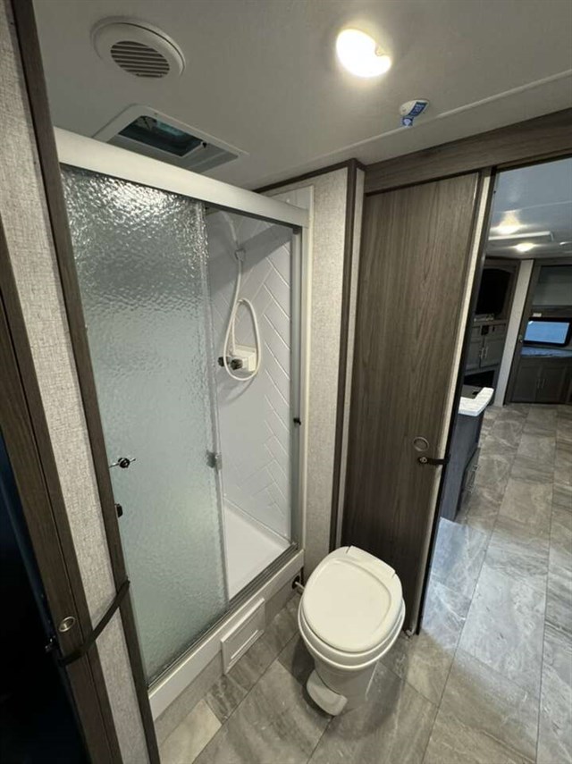Fully equipped kitchen with a refrigerator (12 volt, 10 cubic feet high efficiency electric fridge), microwave, oven, stovetop, and large pantry Spacious walk through bathroom with a shower, toilet, and vanity