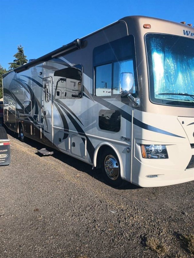 This Thor Motor Coach Windsport 34J is a Class A gas motor home with a full wall driver's side slide out and sleeping for up to nine, including a set of bunk beds.