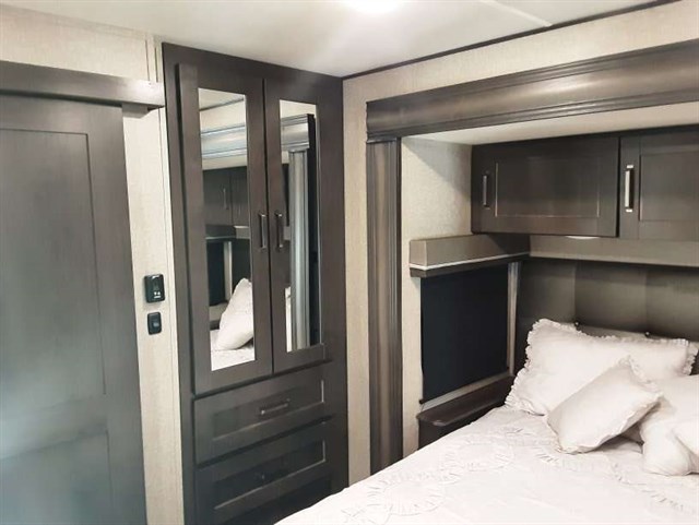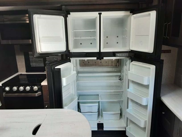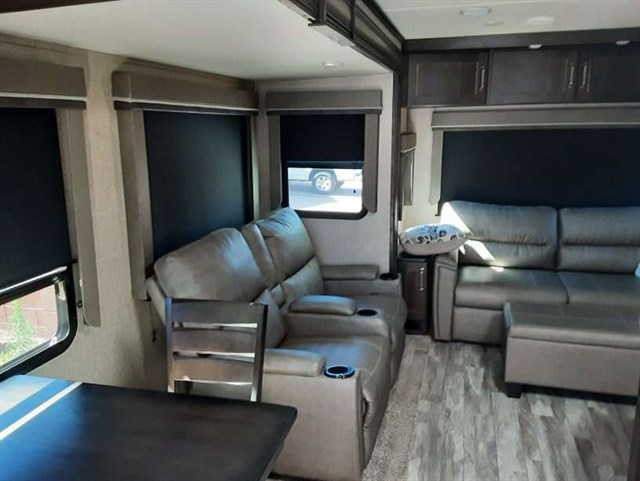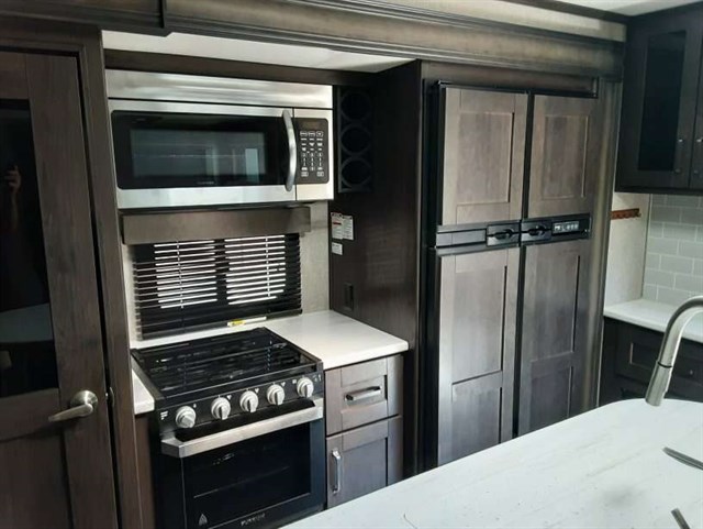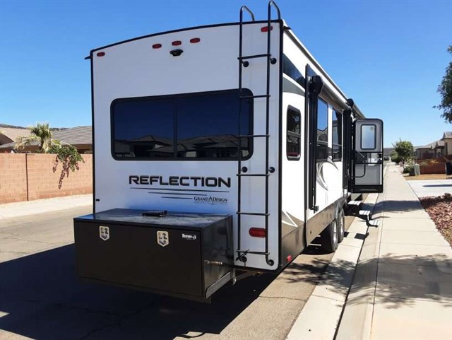 Each Reflection fifth wheel by Grand Design offers luxury along with easy towing to your favorite destinations with the aerodynamic front cap including Max Turn Radius. The Universal All-In-One docking station, LP Quick Connect, and One-Touch electric awning with LED lighting makes setting up and packing up easy for those weekenders or full-timers that like to move around. Inside, you will find the bedroom is complete with a residential queen mattress, a king size wardrobe, oversized underbed storage, and much more! The Arctic 4-Seasons Protection package allows you to camp anywhere and anytime of the year with its heated and enclosed underbelly, EZ winterization, dual attic vents, plus so much more.