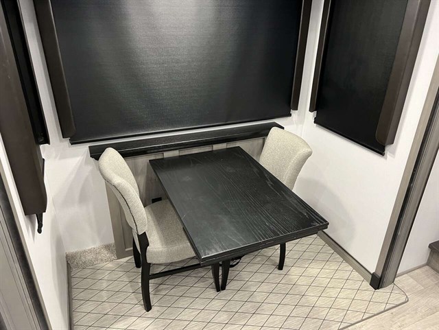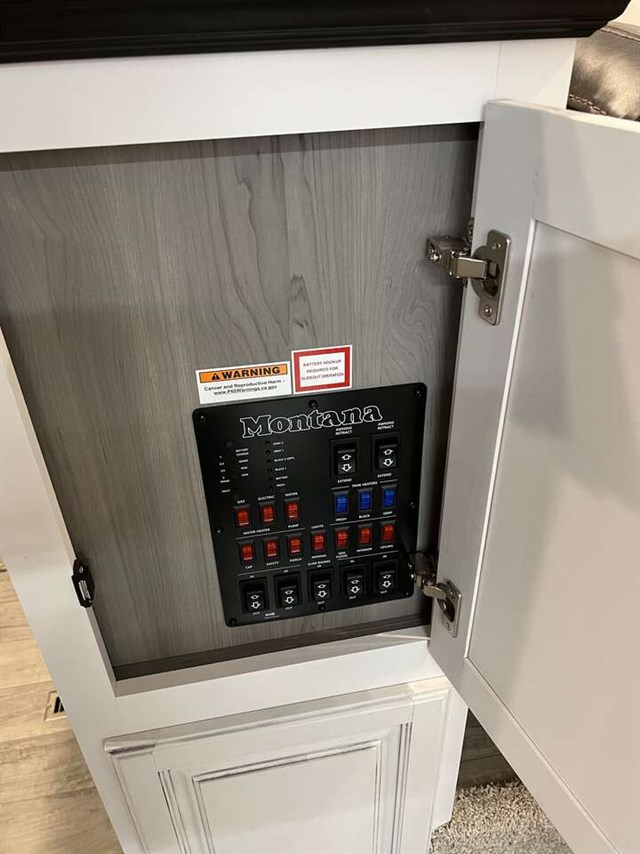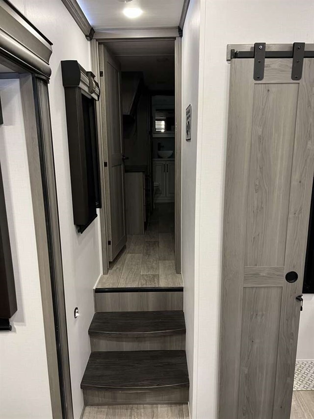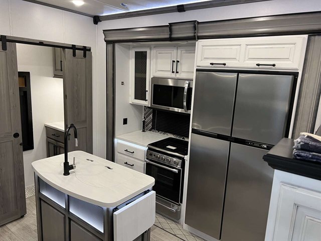 This fifth wheel is pure luxury. The full rear bathroom has a 48" x 30" fiberglass shower with a seat and skylight above, a linen closet to keep your towels close, a dual sink vanity for two to get ready at once, and a barn door to close off the master suite. The bedroom also has a king bed slide with storage underneath across from a dresser with a 32" HDTV and wardrobe, as well as a large closet that is prepped to add an optional washer and dryer. The chef can prepare their best meals with the kitchen island, the glass top range with convection microwave and range hood with a pull-down spice rack, plus there is a pantry/buffet and a free standing legless dinette to enjoy your meals at. The front living area will have you feeling right at home with the front entertainment center that has a telescoping 50" LCD HDTV, a 5,000 BRU decorative fireplace heater, and storage on either side. There is also opposing hide-a-bed sofa slides for extra sleeping spaces and power Thomas Payne theater seating for even more comfort!