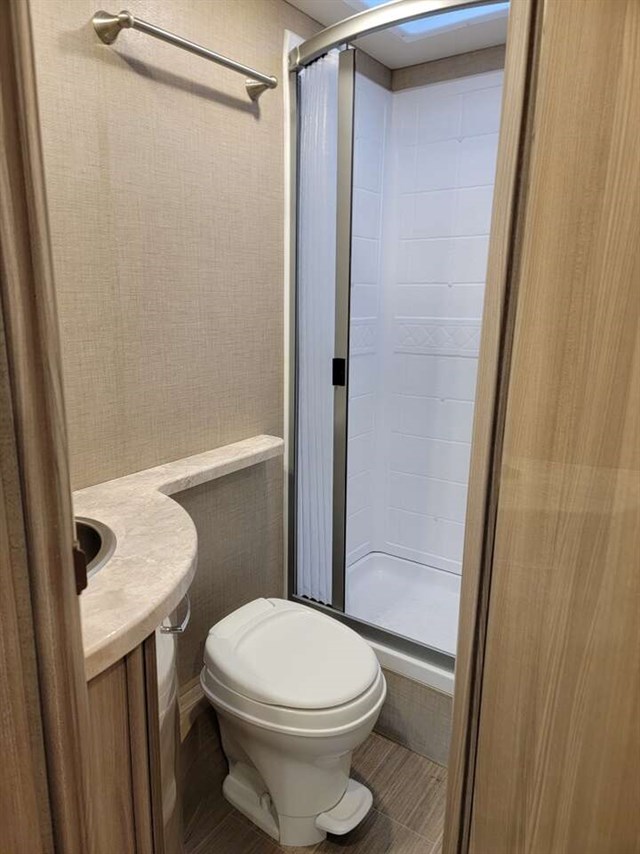 The 12-volt electrical system has been upgraded with a heated Lithium 230 ah battery. It has factory installed solar panels and a WFCO inverter to run 120-volt ac items.