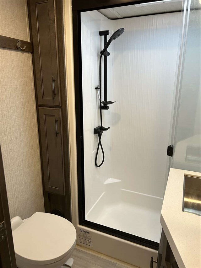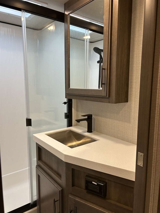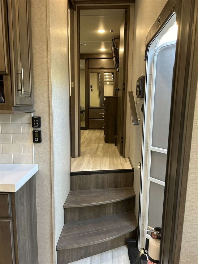 Wow! Check out this fifth wheel with dual entry doors, a private bunkhouse suite, two power awnings, and tons of interior space thanks to the four slide outs! Your guests will have three bunks in the bunkhouse, a tri-fold sofa, plus a convenient half bath with its own exterior entry door. Make yourself at home in the front private bedroom that includes a queen bed that can be optioned out for a king bed, a dresser with an LED TV, plus a large front closet with washer and dryer prep. And don't overlook the main living area/kitchen with theatre seating with USB ports, a kitchen island, plus an LED TV and a fireplace!