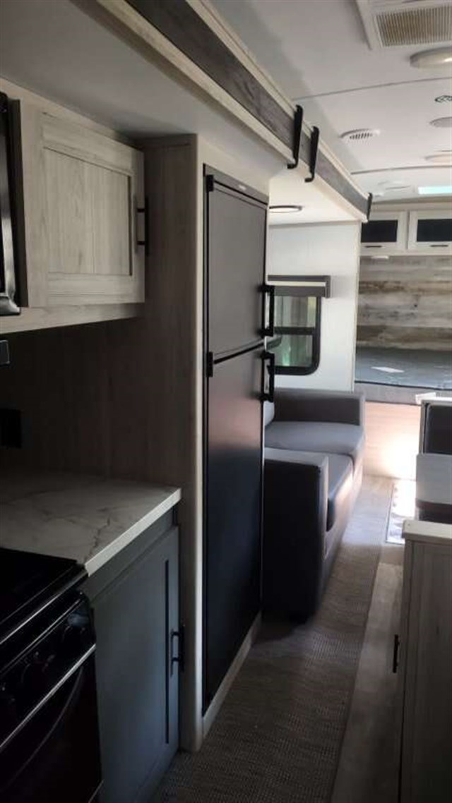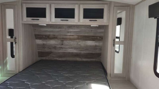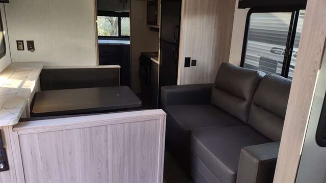 This floorplan is a spacious, front walk around queen bed, rear kitchen trailer with lots of windows on your patio side. The trailer features a large Couch/Kitchen Slide out. The Couch offers “theatre” seating across from the Dinette with the TV behind on an electric lift. The trailer has lots of counter space with the sink counter across the back and a big window to let in lots of light.