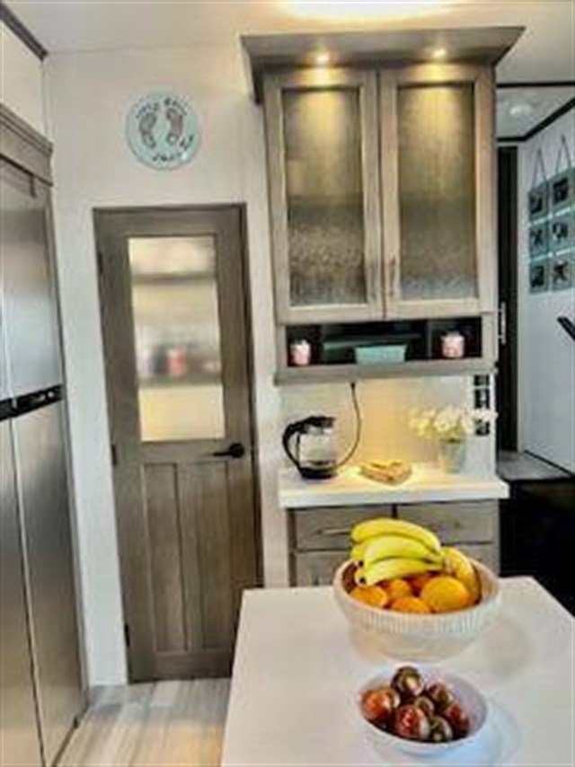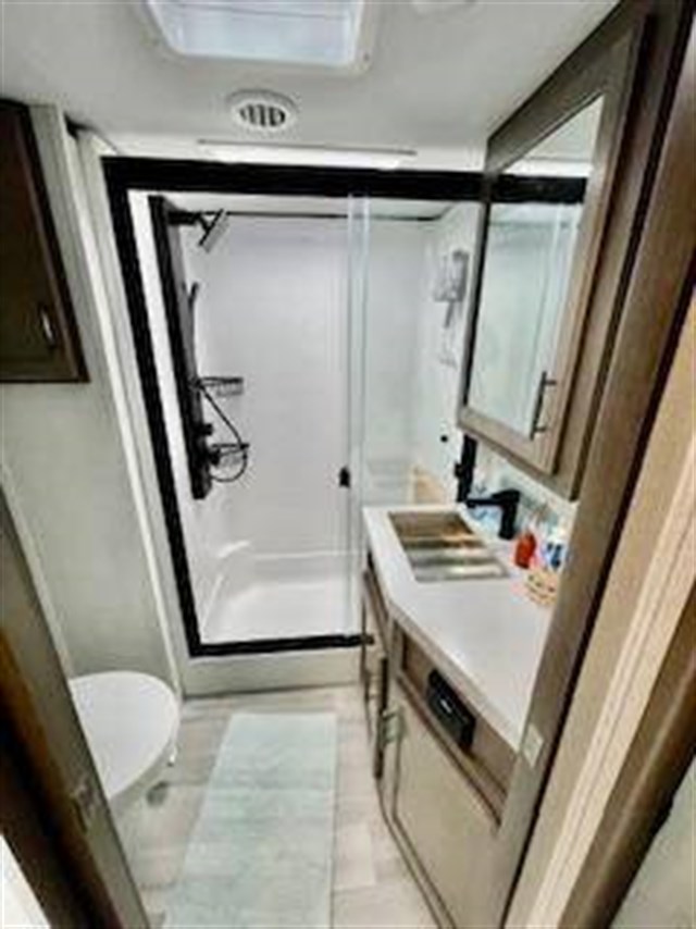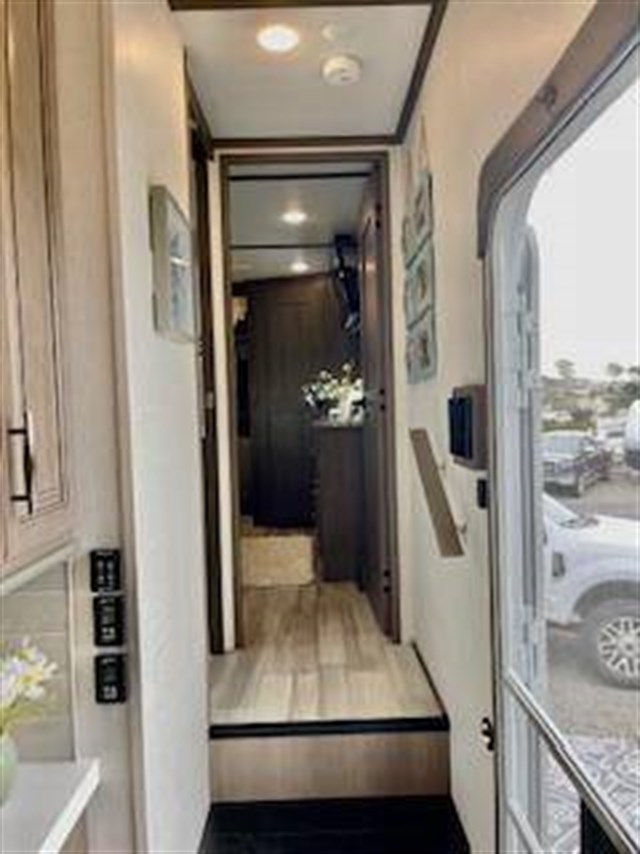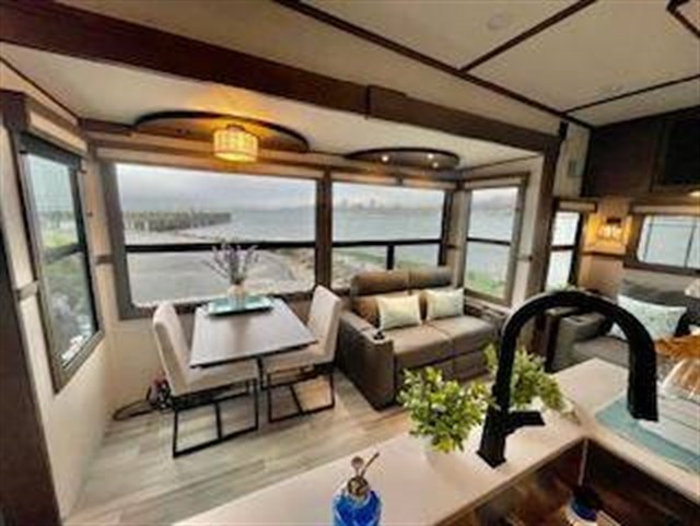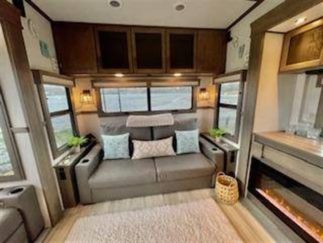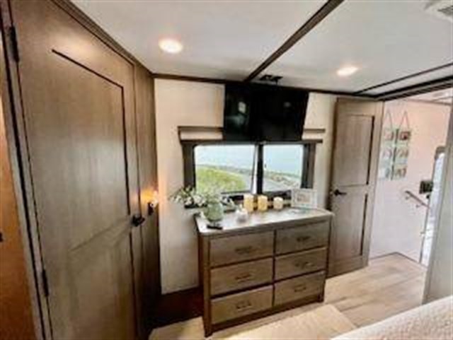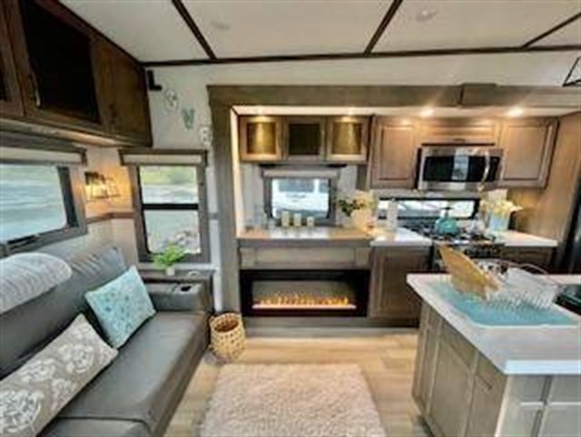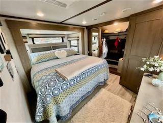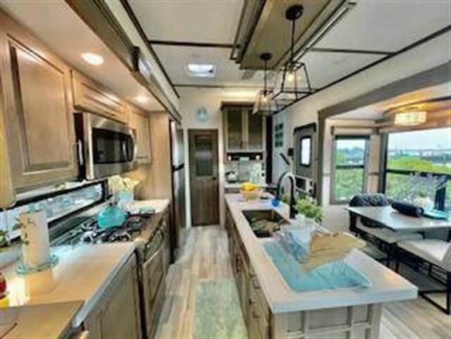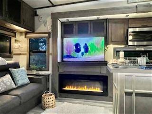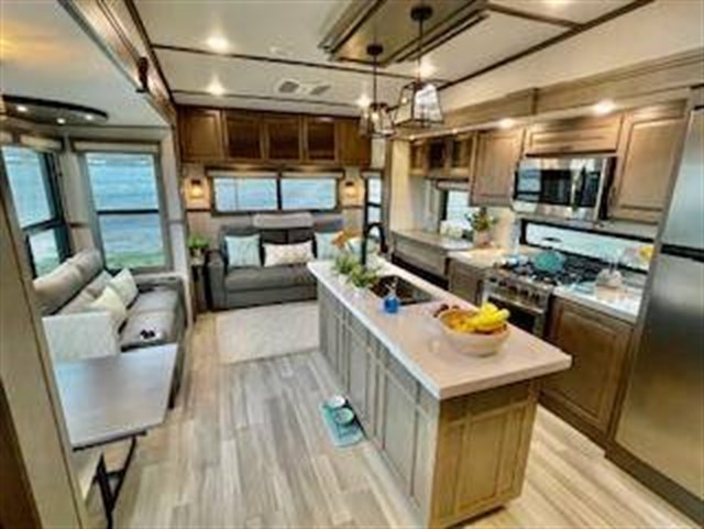 Traveling for long periods at a time is made easy with this kitchen that can feed a group a holiday meal! The professional-grade stainless steel cooktop with a built-in oven, the microwave, the 12V refrigerator and the kitchen island offer everything you will need to enjoy cooking. You will find storage throughout including in the hutch, under the interior steps, and in the front master bedroom. There is a king, a closet prepped for a washer/dryer option, a larger wardrobe, plus a flip-top dresser with an LED TV above. The bathroom includes a shower with a seat and skylight, plus you can add the exterior pull-out kitchen option to enjoy while relaxing under one of the two power awnings. Grand Design features a 101" wide-body construction, heavy duty 7,000 lb. axles, frameless tinted windows, and high-gloss gel coat sidewalls. You can camp year around thanks to the Weather-Tek Package that includes a 35K BTU high-capacity furnace, an all-in-one enclosed and heated utility center, and a fully enclosed underbelly with heated tanks and storage. Inside, you'll love the premium roller shades, hardwood cabinet doors, solid surface countertops and sinks, plus residential finishes throughout to make you truly feel at home. It also includes a MORryde CRE3000 suspension system, self adjusting brakes, and a MORryde pin box that will provide smooth towing from home to campground. 20 CU FT GAS/ELECTRIC RESUDENTIAL REFRIGERATOR; 2ND PATIO AWNING; 30K BTU STEALTH A/C SYSTEM; 3RD A/C 15K BTU; 6-POINT HYDRAULIC LEVELING SYSTEM; 7K AXLE W/ABS BRAKES; CENTRAL VACUUM SYSTEM; ELECTRIC FIREPLACE; KEYED-A-LIKE; KING BED UPGRADE; MAX-BUILT CONSTRUCTION PACKAGE; CUSTOM LIGHTING PACKAGE; RESIDENTIAL LIVING PACKAGE; ROLLER SHADES; RVIA SEAL; 3 PANEL SOLAR SYSTEM; SOLID STEP QUAD ENTRY STP; TV BEDROOM; UPGRADED COOPER H-RATED TIRES; WEATHER-TEK PACKAGE, SLIDE TOPPERS; MOTORIZED TV LIFT IN LIVING ROOM;JBL BLUETOOTH SPEAKER SYSTEM.