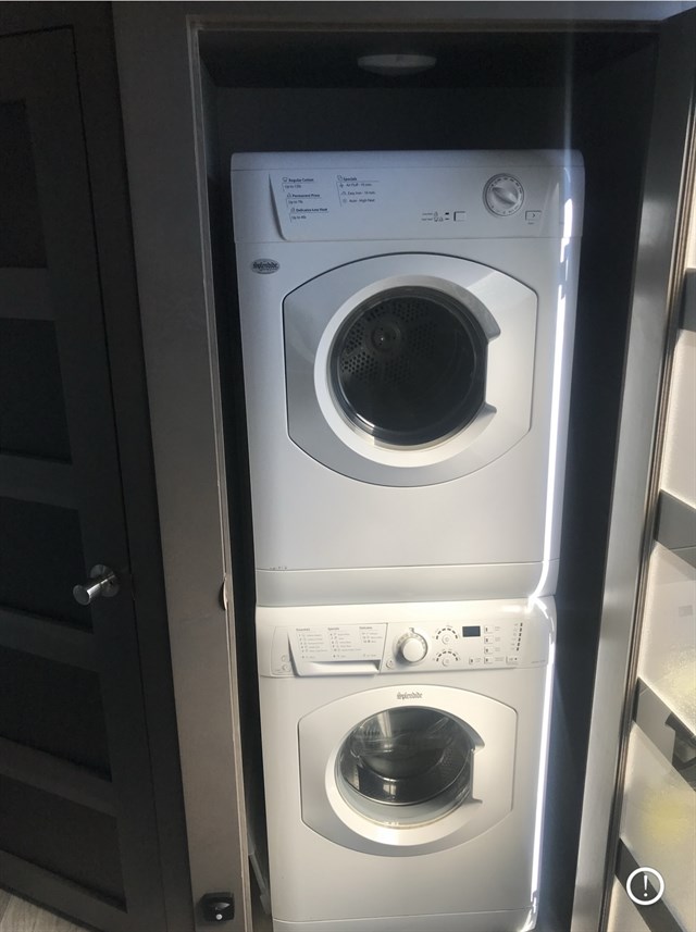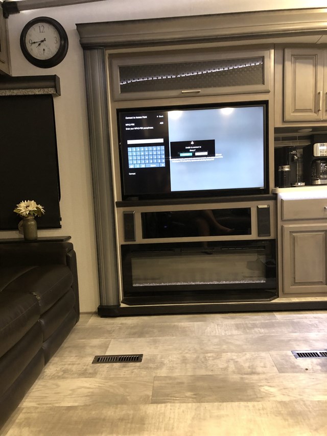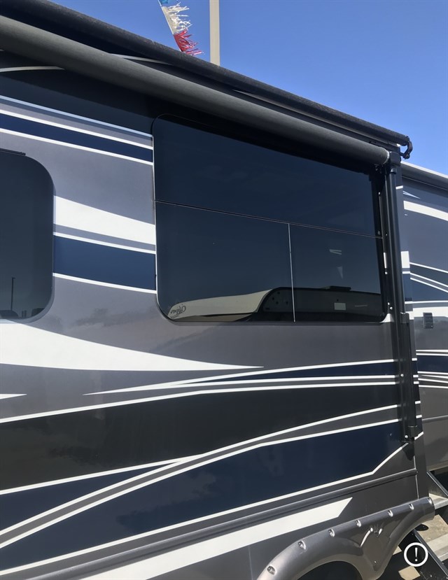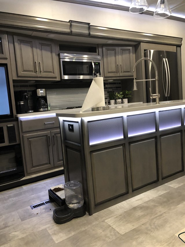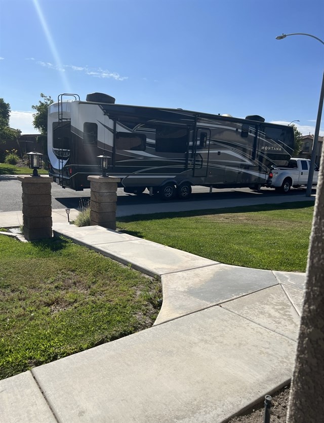 Beautiful painted Fifth wheel. It is a Legacy, so it has everything wood cabinets, dual payne windows, command center fully insulated, king bed, huge closet with hamper and shoe racks, two sinks in the bathroom quiet fans, catV wiring, washer and dryer, inverter and two solar panels flawless interior with pantry two built in trash cans, recliners and pull out couch, desk for work. Back up cameras, awnings on every slide out. Auto level and an island kitchen.