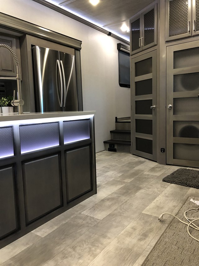 If you want your own space to cook, your own area to watch TV, and your own private bedroom, take a look at this Montana. The rear living and entertaining room includes dual hide-a-bed sofas and theatre seats with power recliners making a cozy place to gather around to talk about your day while staying warm. The kitchen offers a separate space to make and eat meals including a coffee station for the coffee lover in the family. You will also find a center island, an 18 cu. ft. residential refrigerator, a convection microwave, and a pantry allowing you to make any meal while away from home. The barn door into the front bedroom gives you more space, plus the bedroom includes plenty of storage and a washer and dryer.