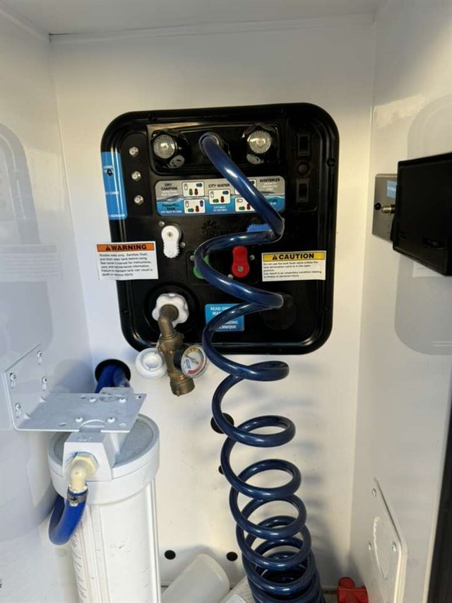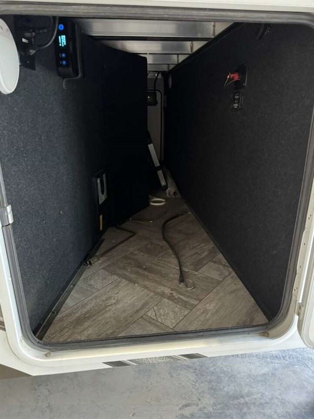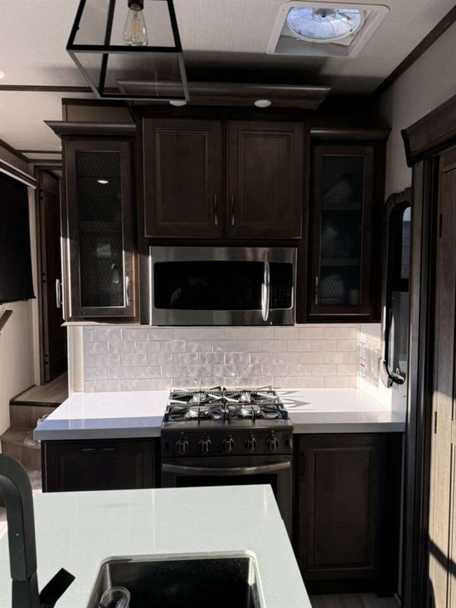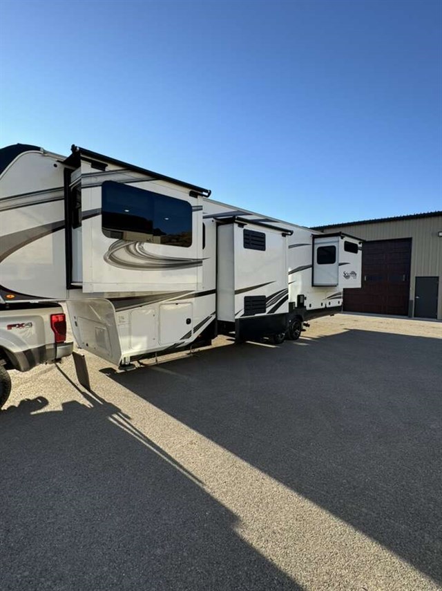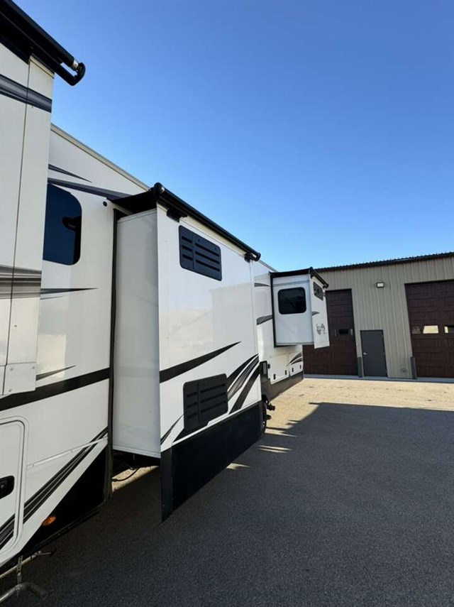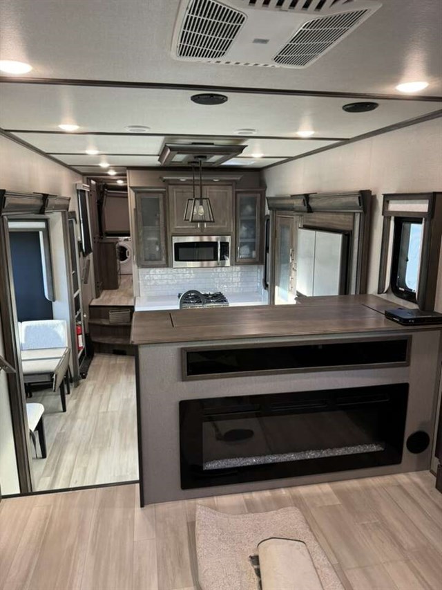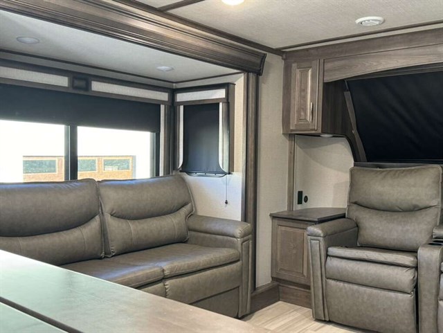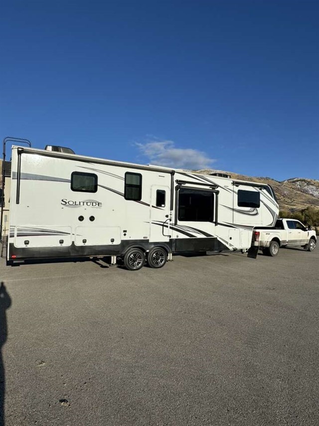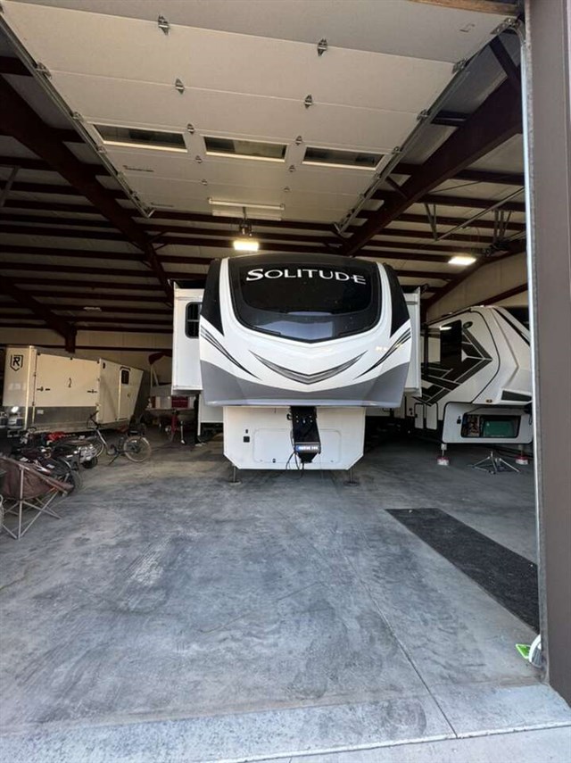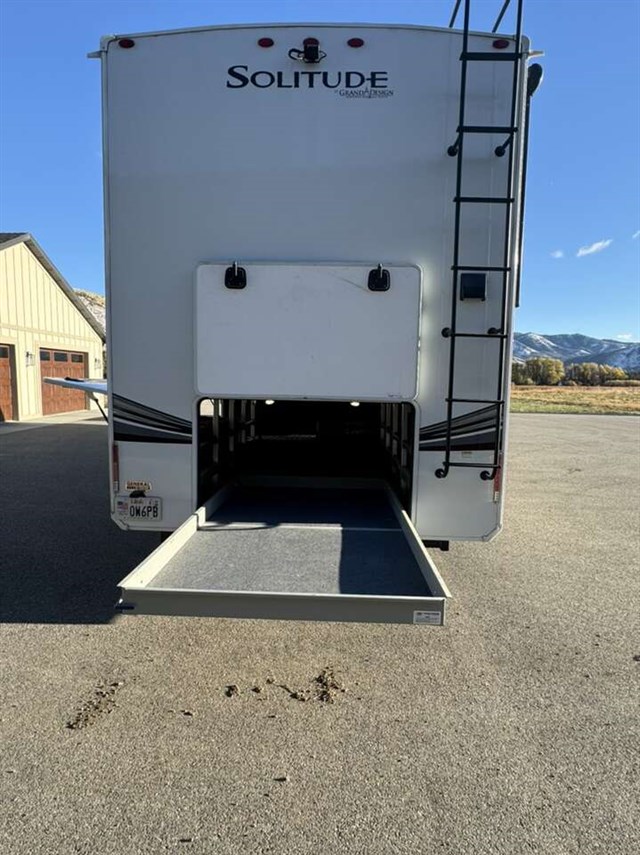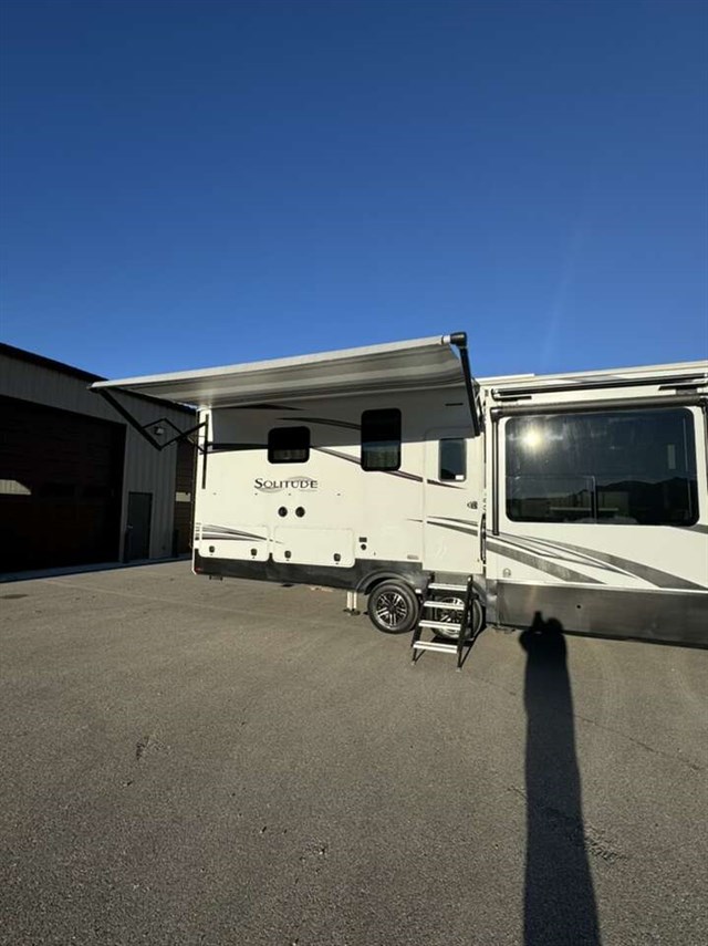 This fifth wheel offers a unique rear exterior storage bay with tray giving you extra space to carry larger items like outdoor camping equipment such as tables and chairs, golf clubs or even your seasonal items if you plan to live in this Solitude. Another popular feature is the separate living area up front giving you manual theater seats, dual opposing tri-fold sofa slides that offer sleeping space for family and friends, and an LED TV with a fireplace below to enjoy. The separate kitchen area is a another great place to gather at the free-standing table with four chairs or around the kitchen island. The cook will appreciate the flip-up countertop, and all the appliances plus the pull-out trash and the oversized pantry with shelves. At night you can retire to the master bedroom to your own queen bed within a slide out or choose the king option, and the pull-out ottoman will come in handy. You might like to add a washer/dryer option to the prepped closet space, and the wardrobe can keep your clothing wrinkle-free and there are drawers to store more items.