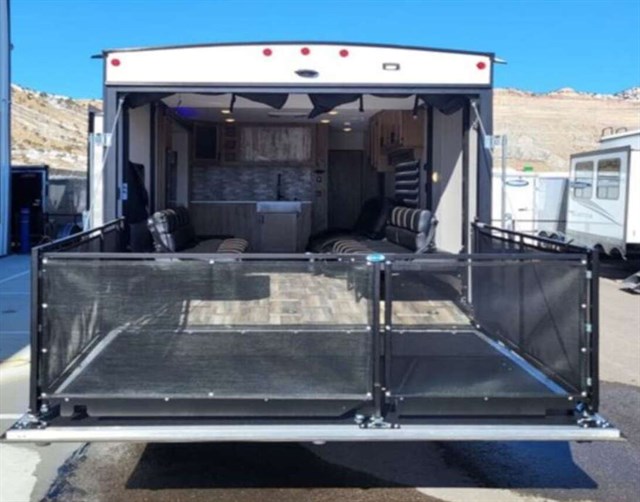 Practically New!!! We bought this brand new and have used it twice (2 nights). Never stored any vehicles inside. Stored indoors. We just don't use it. 15' garage area can store most 4 door side by sides. Solar panels on the roof. Double bunks, oversized, each could easily fit 3-4 kids or 2-3 adults. King size bed in master. Porcelain commode (not plasitc). Tall shower. Onboard generator with remote start. Internal gas tank (30 Gallon). Loading ramp doubles as a "party beck" with sceen door. Kitchen slide to create a large open area when all set up. Outdoor Shower/spray nozel. Because she requested it off? Indoor/outdoor speakers. 96 Gallon Fresh Water tank. Power stabilizer jacks and power tongue. INCLUDED EXTRAS: 2 TV's mounted in master and living area. Blackstone griddle w/propane hose quickcinnect. Equalizer hitch. Outdoor rug. Wheel chaulks. More camping and travel trailer essentials. This is ready to go! full propane tanks, perfect tires, You could hook up, fill the fresh water tank and head to the mountains. We are located in South Jordan, however the trailer is stored in West Jordan.