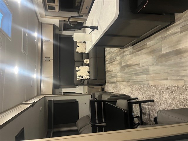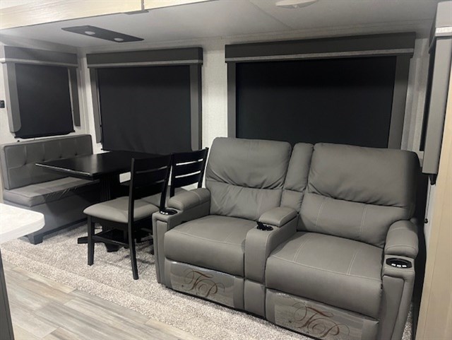 As you enter notice the spaciousness inside with dual opposing slide outs on either side of the unit. The slide to your left of the entry door features a free standing dinette (pictured) along with an entertainment center, 40" TV and fireplace including overhead cabinets.