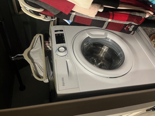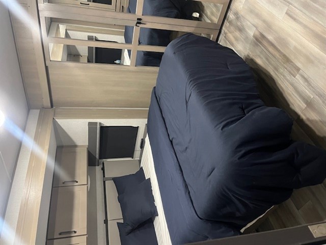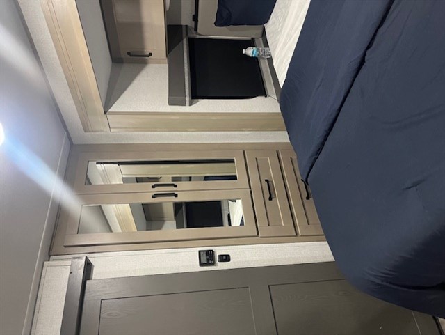 The private front bedroom can be entered from the hallway door, or through the sliding door in the bathroom. In the bedroom find a queen bed with overhead cabinets, bedside nightstands, and a slide out double wardrobe that also contains the bathroom linen cabinet.