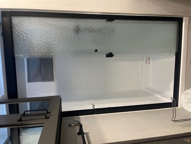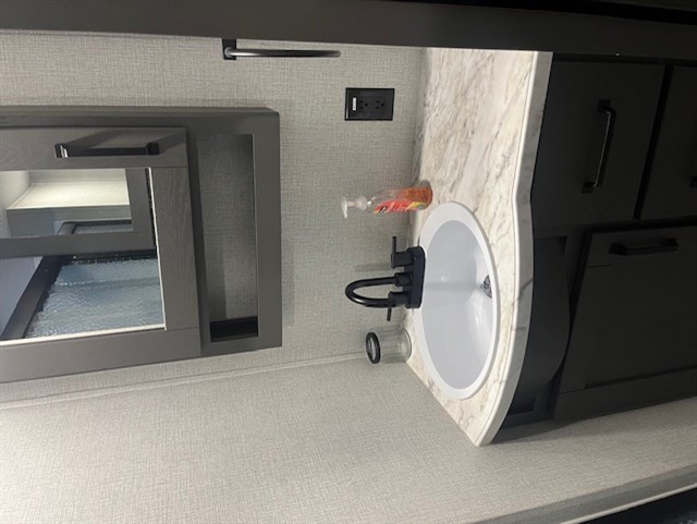 The slide opposite the door side features even more seating with theatre seats for two including cup holders and overhead cabinets for your things. There is also a refrigerator, and three burner range with convection microwave oven within the slide out too. Along the interior living area wall find a countertop with a kitchen sink, overhead storage, plus lower cupboards and drawer space for dishes and things.