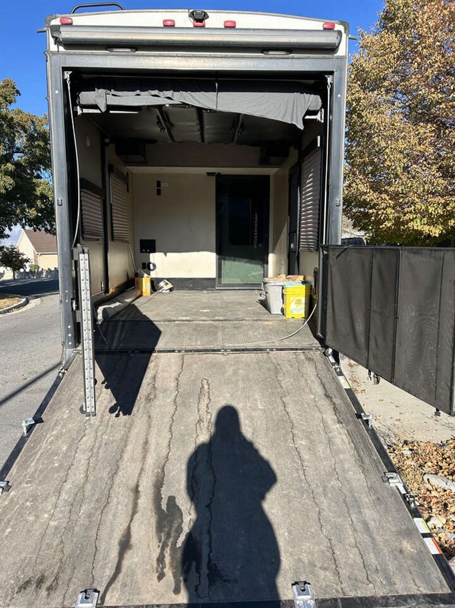 ** Cargo area: Washer/dryer hookups, rollout carpet, tie-down points, back ramp can be converted into a patio with "fencing" around, and pull down screen.