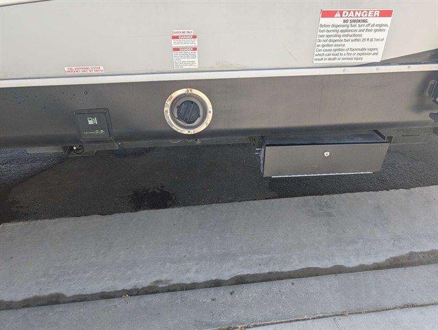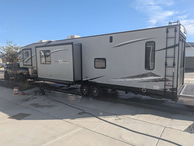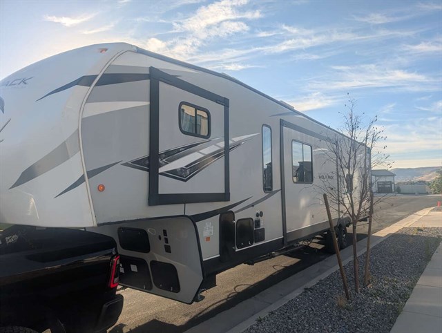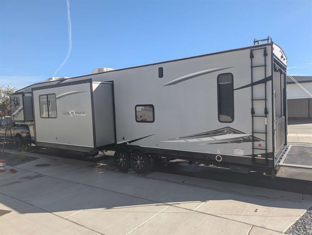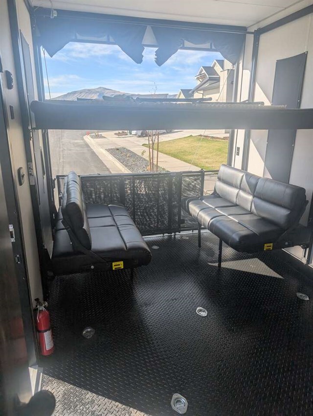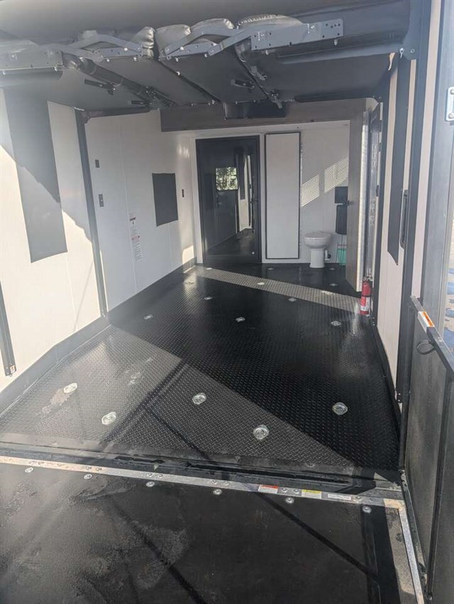 The trailer is 43 feet 7 inches long, It has 100 gallon fresh water tank, 76 gallon tank for grey water. 30 gallon fuel station, 2 large awnings, 2 ac units, and a rear deck. The trailer is 43 feet 7 inches long, It has 100 gallon fresh water tank, 76 gallon tank for grey water. 30 gallon fuel station, 2 large awnings, 2 ac units, and a rear deck.