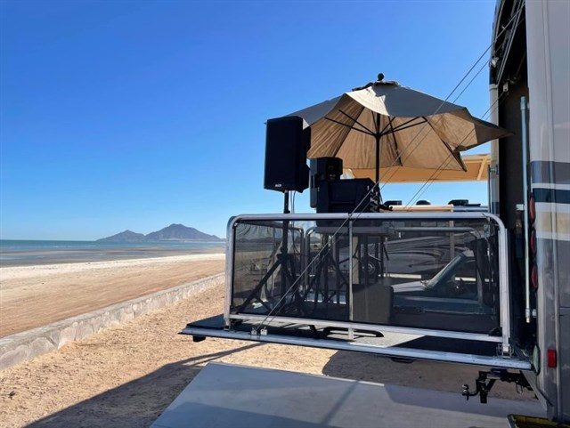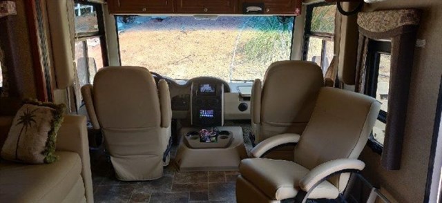Length: 38.33 ft. (460 in.) Width: 8.42 ft. ( 101 in.) Height: 13.5 ft. (162 in.) GVW: 26,000 Towing Capacity: 5,000 lbs. Fuel: 80 gal. Gasoline Remote Fuel Filling Station w/Pump & Nozzle Propane Tank: 24.8 gal. Chassis Brand: Ford Chassis Model: F-Series Super Duty Transmission: 5 Speed Automatic Overdrive: Yes Holding Tanks: 100 gal. Fresh Water Tank 43 gal. Gray Water Tank 43 gal. Black Water Tank Tires: Toyo M1 245/75R225 Tires Replaced: 3/30/2020 Brakes: Master Brake & Mufler Replaced on 6/13/22 @ 19,616 mi. Jacks: Automatic leveling jacks w/touch pad controls Garage: Inside Dimension: 10’L x 6’6.5”w Washer/Dryer Prep in Garage Tie Down Rings in Garage Drop Down Ramp Door w/Spring Assist & Railing for Patio Use Ramp converts to party platform Heating & Air Conditioning: Dometic (2) 13.5 Low Profile Roof A/C’s BTU: 13,500 Frigidaire (1) in garage 12V Attic Fan in Kitchen & Bathroom 6 Gal.Gas/Electric Water Heater Awnings: Electric Patio Awning Slide-Out Room Awning(s). Windows: Frameless Single Pane Windows Electric Windshield Solar & Privacy Roller Shades Beds: Electric Overhead Hide-Away Queen Bunk Booth Dinette turns into oversized twin Loft Master Bedroom Above Garage Queen Mattress w/Pillows & Shams In Loft Queen sized memory foam mattress (2) Jacknife sofas in garage. Turn into King sized bed Seating: Dual Cargo Sofas in Garage Area Leatherette Sofa/Driver Side Leatherette Euro Recliner/Passenger Side Booth Dinette Leatherette Passenger Chair AV: Back Up Camera and Monitor AM/FM Dash Radio w/Bluetooth & Apple CarPlay 40″ TV in Living Area 19″LED TV in Loft 19″LED TV in Garage Exterior 32″TV Video Package (DVD Player) Premium Sound System w/ Exterior Remote in Garage Generator: Onan RV QG 5500 Gas Generator Mirrors: Heated,Remote Ext Mirrors w/lntegrated Side View Cameras Doors: 2 Doors / No sliding Glass Door Refrigerator: 8 CuFt Double Door Refrigerator Batteries: Dual Auxiliary Batteries Interior: Metallic Cabinetry: Vintage Exterior: Rock Island FBP Solar: 200w.