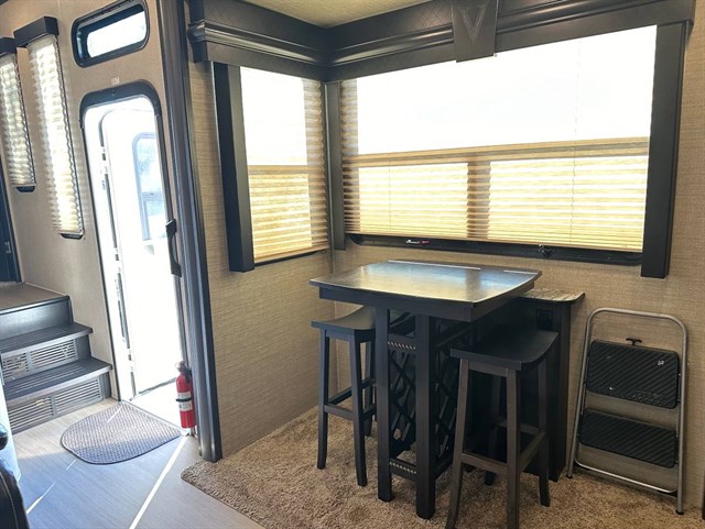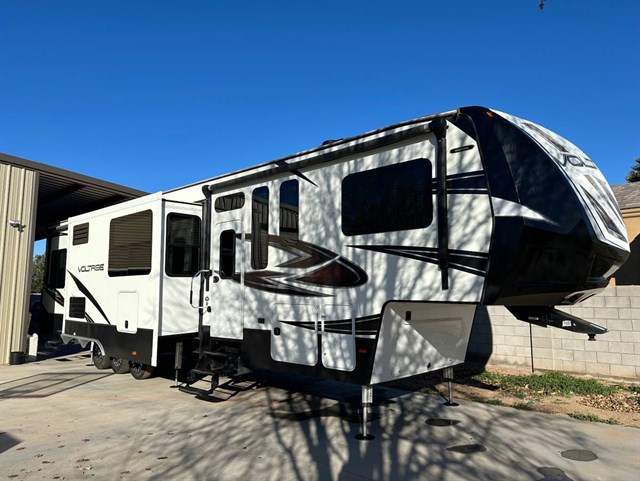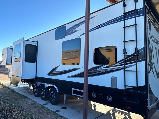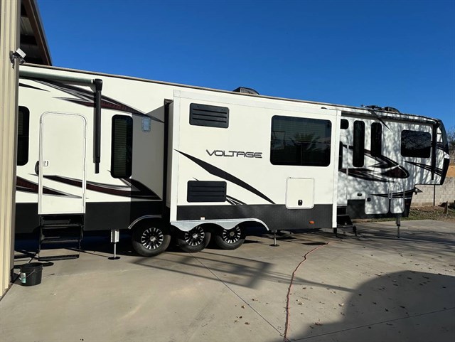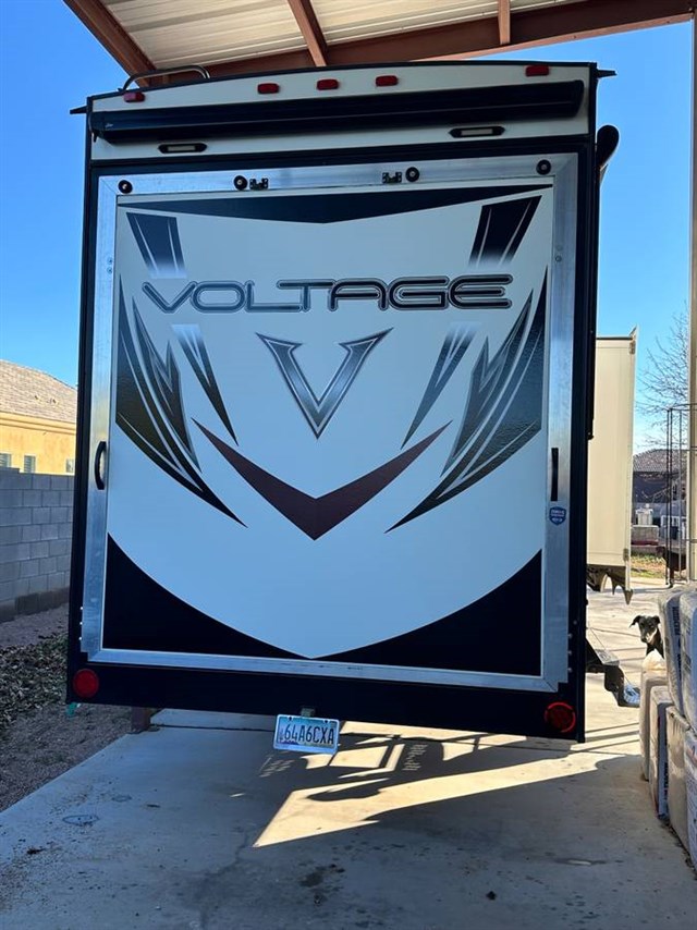 This Voltage V3305 fifth wheel toy hauler features a spacious living area with room for a few extra friends!