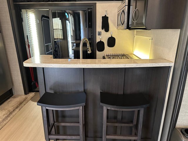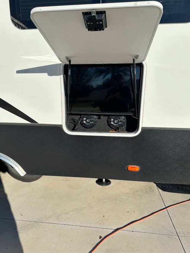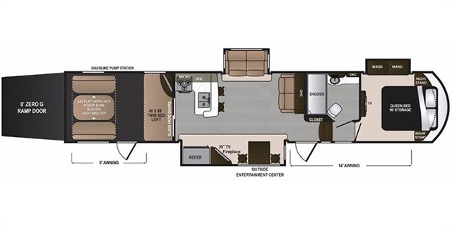On the outside find a gasoline pump station off the cargo area that will keep the fun going all weekend long, and a generous pass-through compartment for plenty of outdoor camping gear and more. There is an optional outside entertainment center that is located under the 18' awning that covers the main entry door to provide an outdoor living space, and an optional 10' awning if you like, plus a ramp door patio with entry steps and awning option, and so much more!