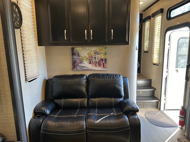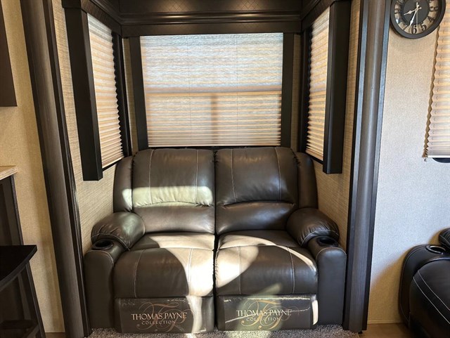Along the road side wall find a slide out reclining sofa seating with a stowable table. A nice entertainment center with a TV, storage cabinets and a fireplace below are featured on the exterior bath wall and can be easily viewed from the living and kitchen area.