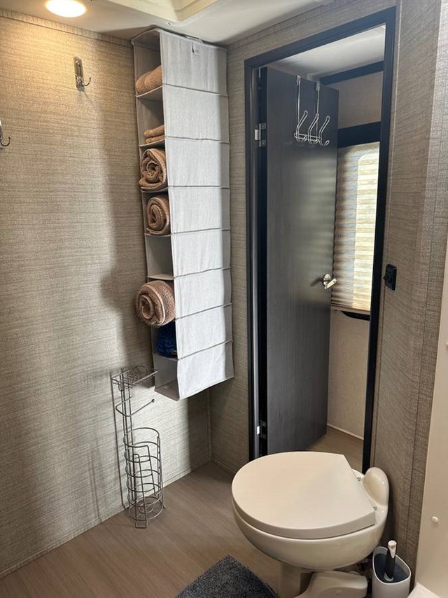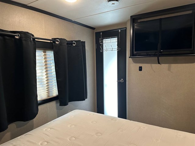 You can also enter the front bedroom from the steps near the slide out sofa. The bedroom provides a private relaxing space to unwind from a fun filled day. There is a comfy queen bed with storage below, nightstands on either side, plus his and hers wardrobes that slide out for added interior space.