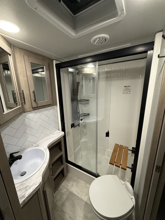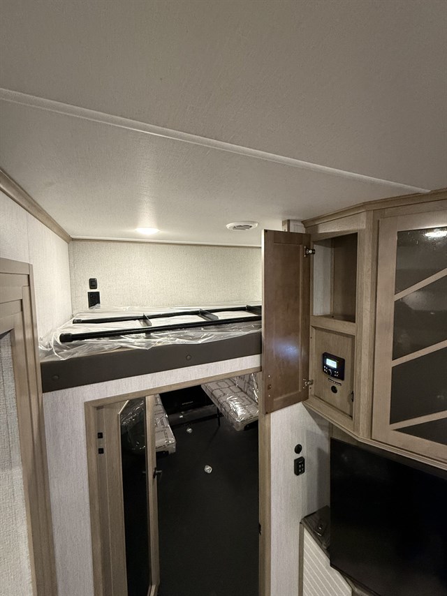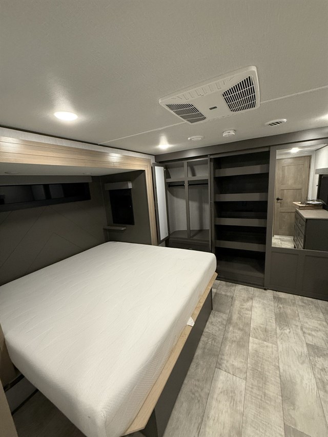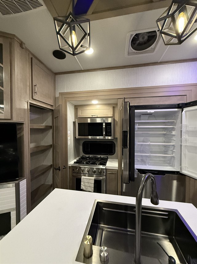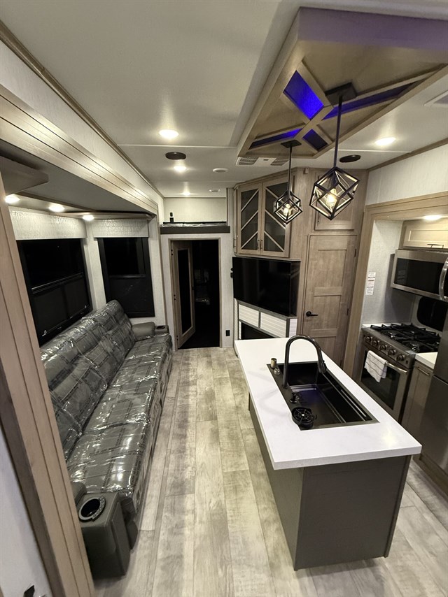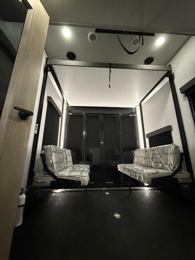 Traveling with friends and family can be comfortable when you have a full double entry bathroom and a half bath available when camping and enjoying the trails on your off-road toys! You will have an 11' garage space that can become a second living/dining area as well as a bedroom. There is an overhead loft bed and a four-seat sofa slide for more sleeping space in the main living area. Everyone can watch the 49" LED TV when waiting for dinner, and enjoy the fireplace on those chiller nights. The kitchen island offers a sink to wash dishes, extra counter space for serving meals and two stools to dine at. The cook will love all the upgraded appliances, and the space thanks to the slide. The front bedroom gives you a queen bed slide lots of clothing space, and a flip-up dresser for even more storage.