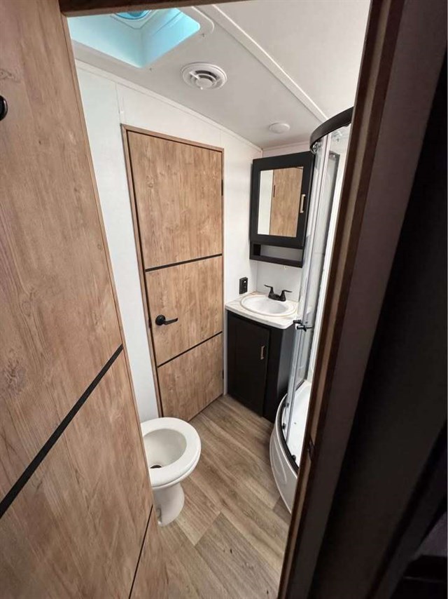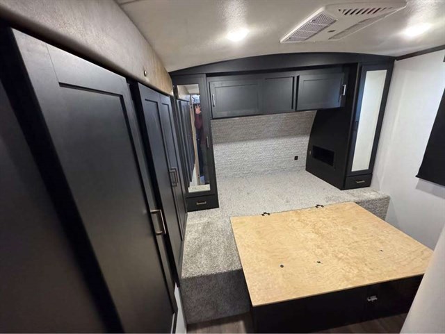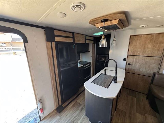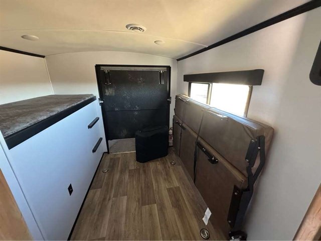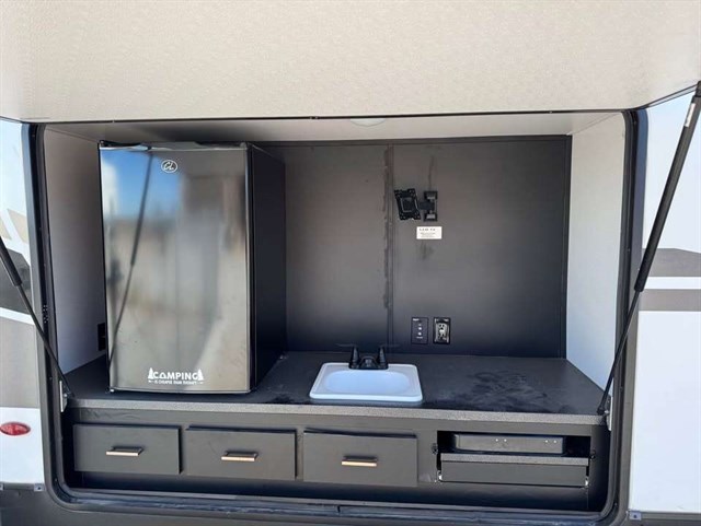 Looking to enjoy some off-road fun with your toys at an RV park that allows you to park your trailer? Then load up the rear 56" ramp door with an extension into 8'4" of cargo space. There is also a flip sofa sleeper here and a bunk above an entertainment center where your guests can sleep. The main living and kitchen area offers two slides for more interior space, a kitchen island with a skylight above, plus a pantry, a booth dinette and sofa sleeper. There is even a fireplace with 40" HDTV above for inside entertainment. The cook will have an outside kitchen to whip up some meals while others enjoy the 21' awning. You will find plenty of storage throughout including in the wardrobe slide in the bedroom, and there is a built-in pet kennel for your family's best friend.