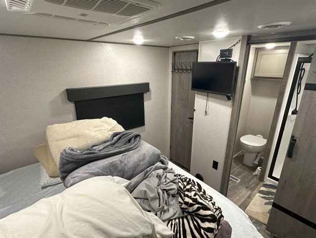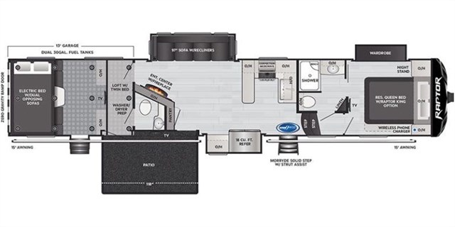 The Keystone Raptor toy hauler has rugged flexibility that will entice any adventurer! The Raptor's sophisticated design makes it an attractive choice for anyone, and the hardworking innovation makes it suitable for all thrill-seekers. No matter who you are, the Raptor has something that you'll love, like the wireless phone charging station, on-board fuel station, Zero Gravity ramp door, Onan 5,500W gas generator, and Furrion wireless back-up camera. The heated and lighted pass-through storage area gives you an additional space to place your gear, and the outside shower allows you to rinse off your toys or muddy boots before coming inside. The Raptor also has a few Keystone-exclusive features, like the Tru-fit slide construction, KeyTV, and Tuf-Lok thermoplastic duct joiners.