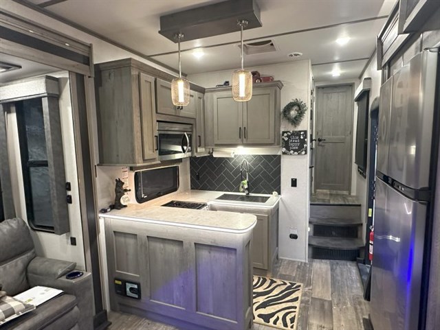 This 2021 47′ Raptor 5th wheel toy hauler with 3 slides is pure luxury wherever you might be travelling.
