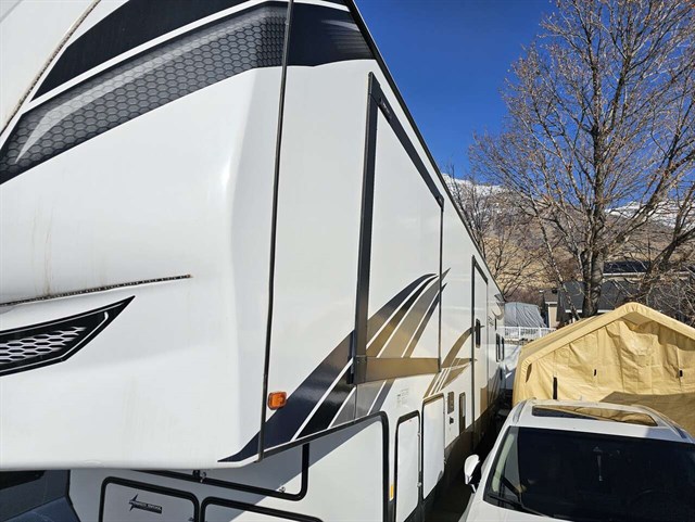 Everyone will stay clean with a bath and a half in this fifth wheel toy hauler! It was rated "fifth wheel of the year" by RV News for 2021 too. The front private bedroom has a 72" x 80" king bed slide to lay your head on at night, a front wall wardrobe, and a dresser to keep your clothes looking nice, plus an entrance into the dual entry bathroom. The kitchen has plenty of countertop space to prepare your meals and a refrigerator to store any leftovers. The garage area has a loft, opposing flip-up sofas with a table in between and a raised queen bed above them, as well as an entrance and an area prepped to add a optional washer and dryer!