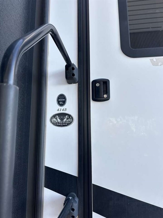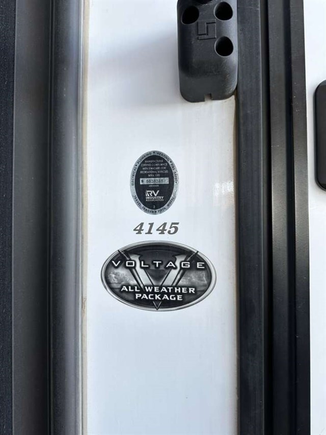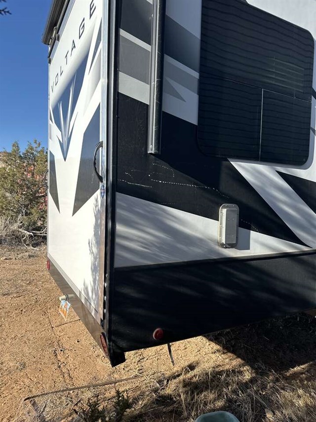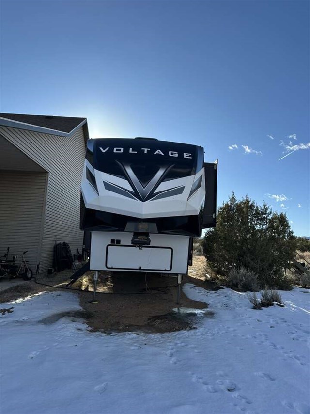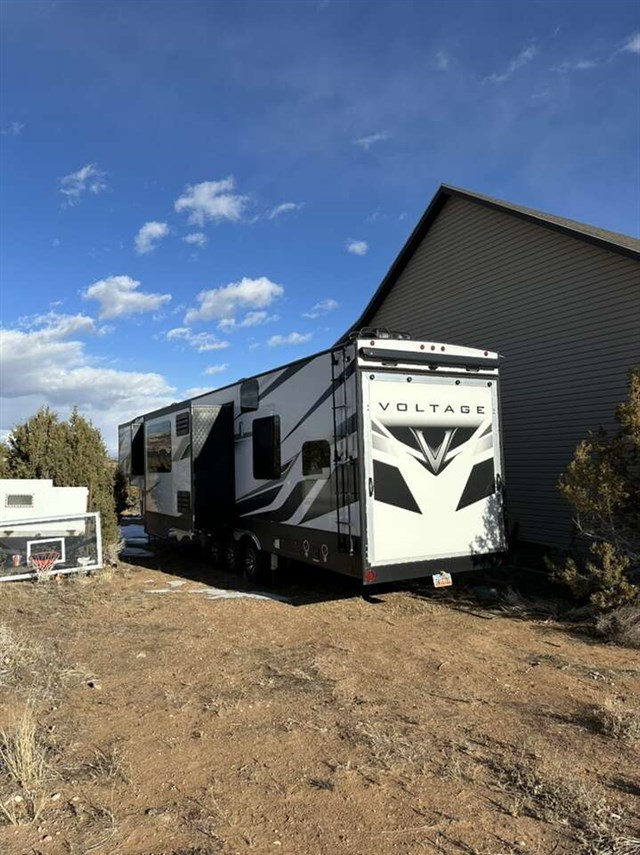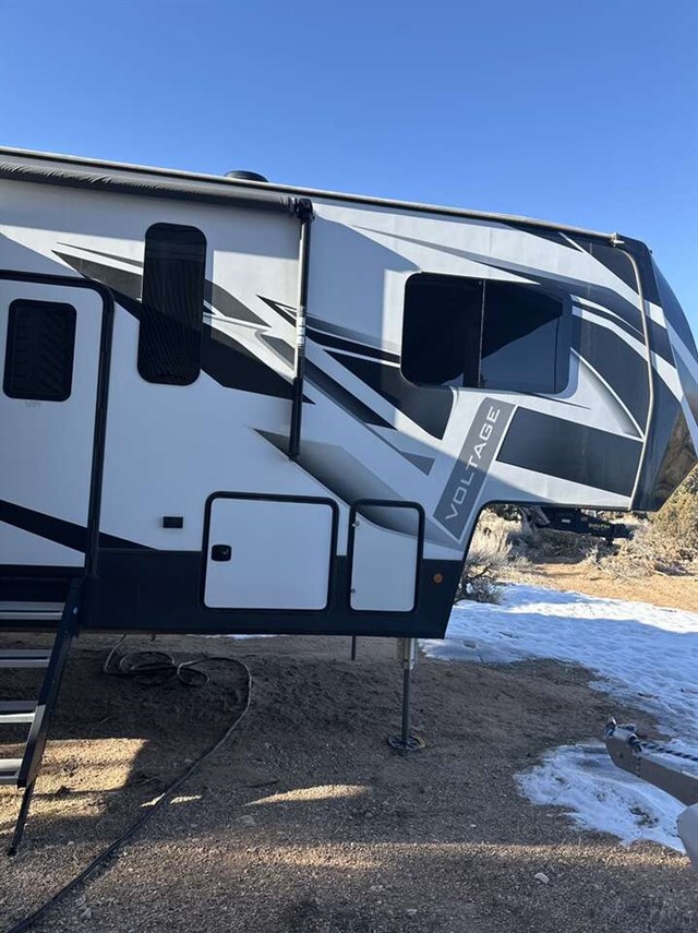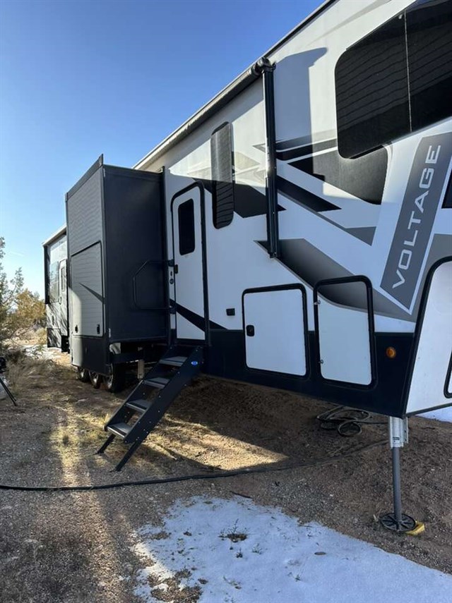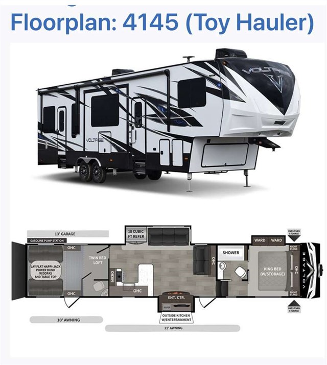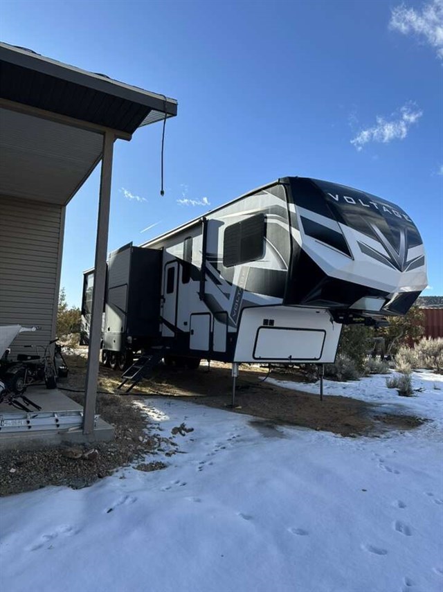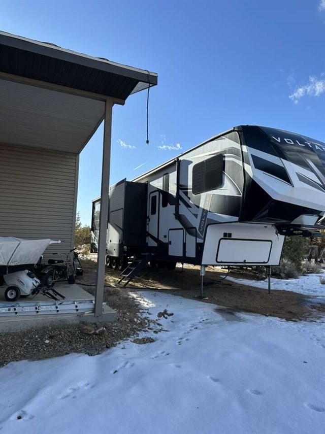 2020 Voltage 4145 triple axle Toy Hauler. This is a very well taken care of, non smoking Toy Hauler, mainly used in a mobile home site, and not used but a few days a year. It has 3 slides, very roomy in the living and kitchen area with seating for 5-6 people, couch with 3 recliners with heat and vibrate, as well as a love seat with 2 recliners with heat an vibrate mode, room for a couple of small bar stools if wanted. It has a 13' garage with 2 beds in the garage area, and can also convert into a dining area, back sliding glass doors with access to a patio area out the back, can sleep up to 7 people with loft area above. The master bedroom has an upgraded very nice queen mattress. Onboard electric start Onan Q5 5500 EVAP generator with a 20 gal fuel tank. Outdoor kitchen area with a stove, fridge and entertainment system. All weather package with heated holding tanks and extra insulation through out ceiling and underbelly. Solar panel on roof keeps batteries charged. 50 amp service with 50' cord, which will run all 3 air conditioners. Automatic electric leveling jacks, 160 gallon fresh water tank, with 88 gallon gray water tank, and 84 gallon black water tank. Full size refrigerator w/freezer. This is a very nice top of the line RV with lots of room.