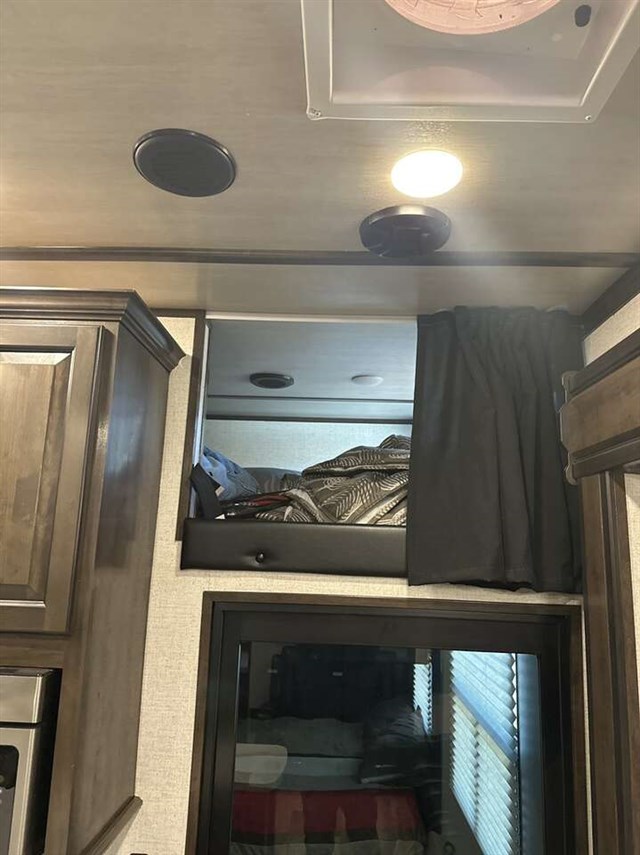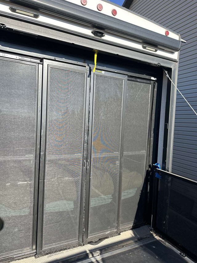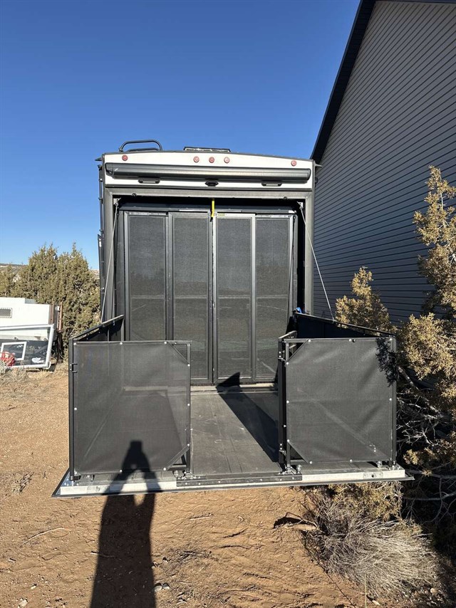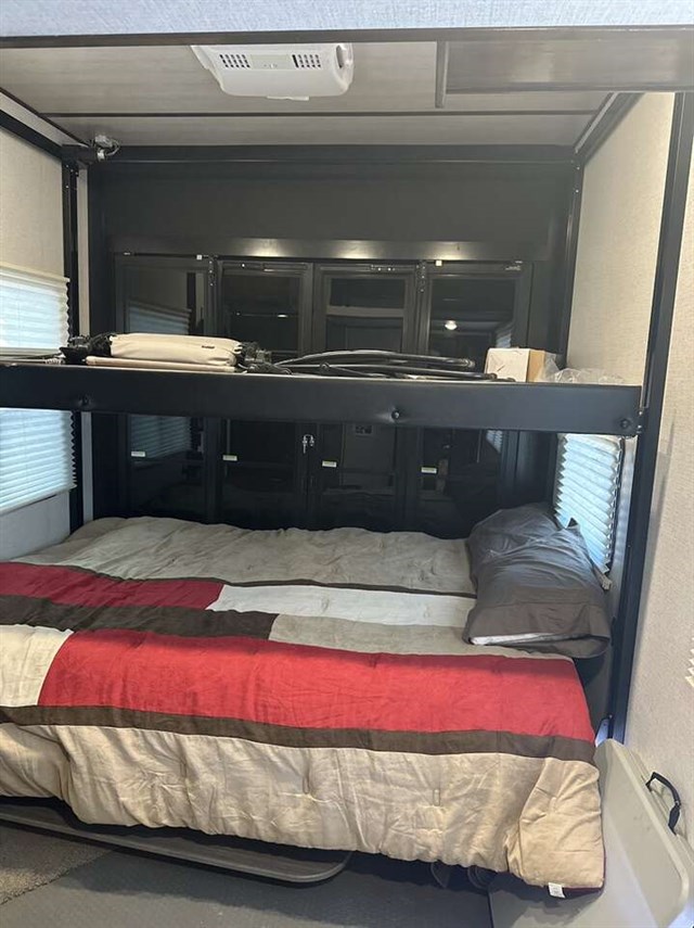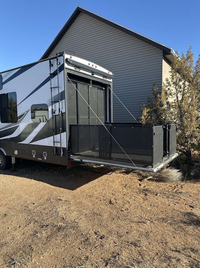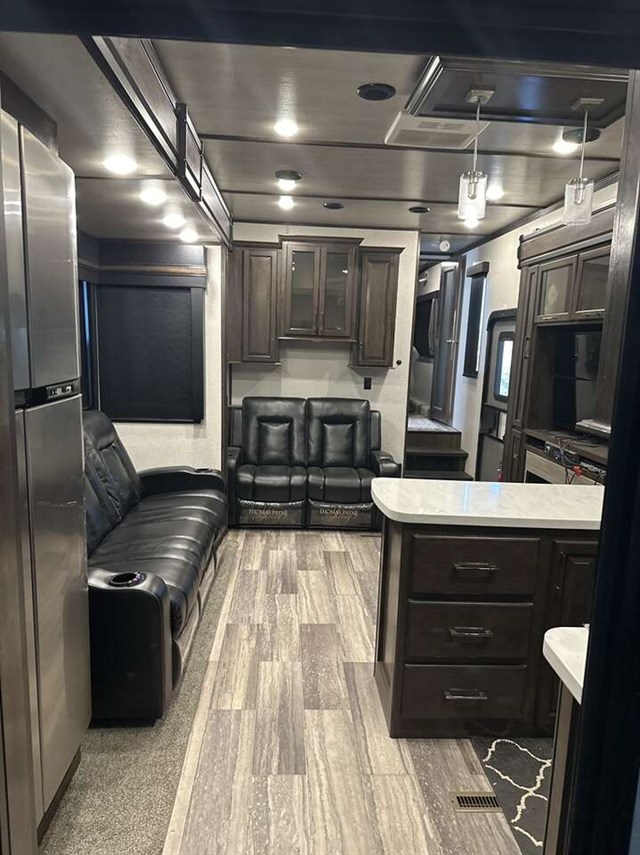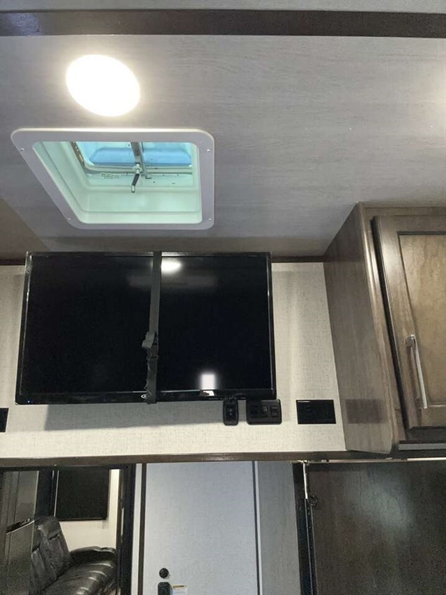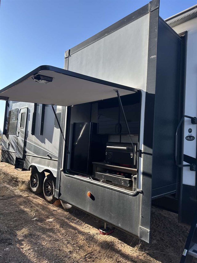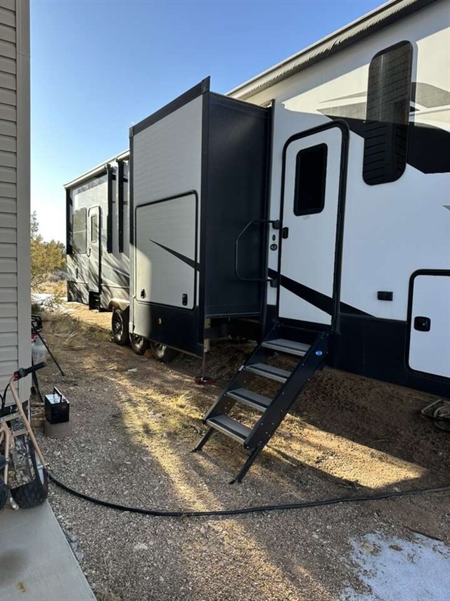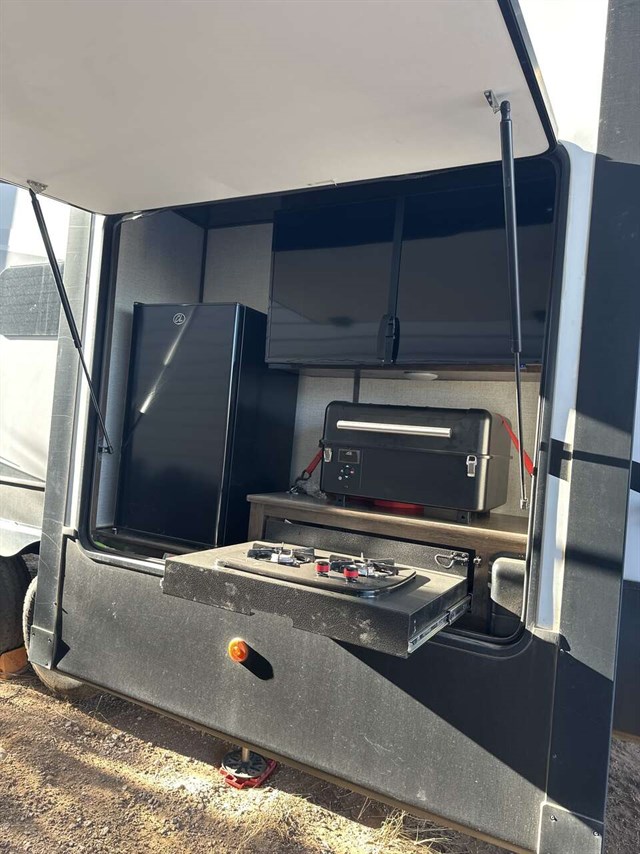 2020 Voltage 4145 triple axle Toy Hauler. This is a very well taken care of, non smoking Toy Hauler, mainly used in a mobile home site, and not used but a few days a year. It has 3 slides, very roomy in the living and kitchen area with seating for 5-6 people, couch with 3 recliners with heat and vibrate, as well as a love seat with 2 recliners with heat an vibrate mode, room for a couple of small bar stools if wanted. It has a 13' garage with 2 beds in the garage area, and can also convert into a dining area, back sliding glass doors with access to a patio area out the back, can sleep up to 7 people with loft area above. The master bedroom has an upgraded very nice queen mattress. Onboard electric start Onan Q5 5500 EVAP generator with a 20 gal fuel tank. Outdoor kitchen area with a stove, fridge and entertainment system. All weather package with heated holding tanks and extra insulation through out ceiling and underbelly. Solar panel on roof keeps batteries charged. 50 amp service with 50' cord, which will run all 3 air conditioners. Automatic electric leveling jacks, 160 gallon fresh water tank, with 88 gallon gray water tank, and 84 gallon black water tank. Full size refrigerator w/freezer. This is a very nice top of the line RV with lots of room.