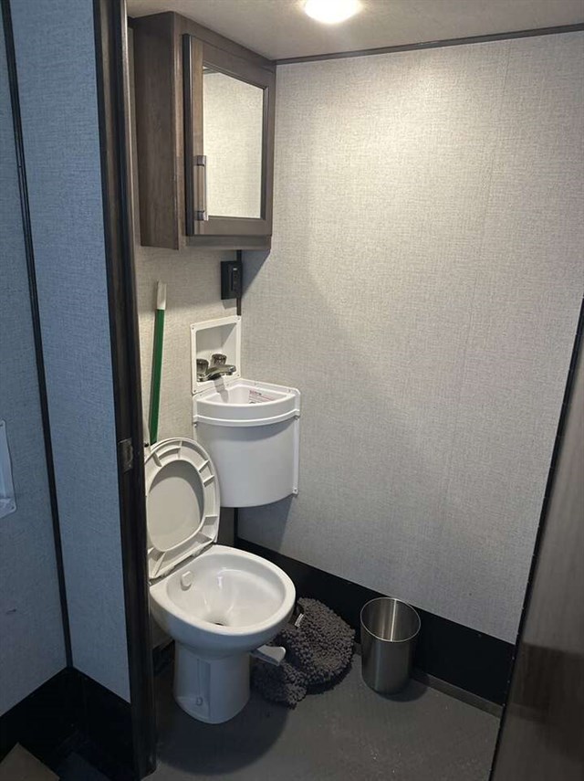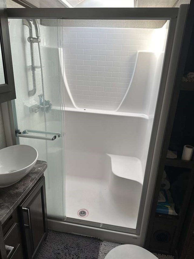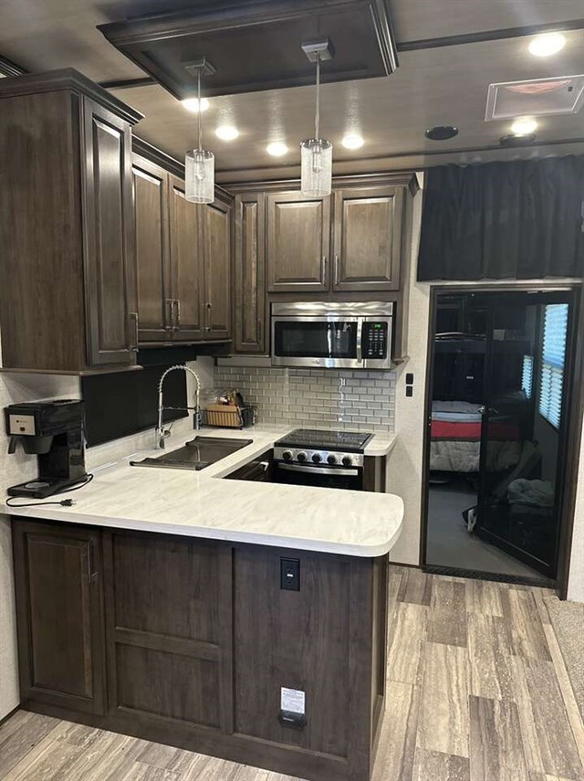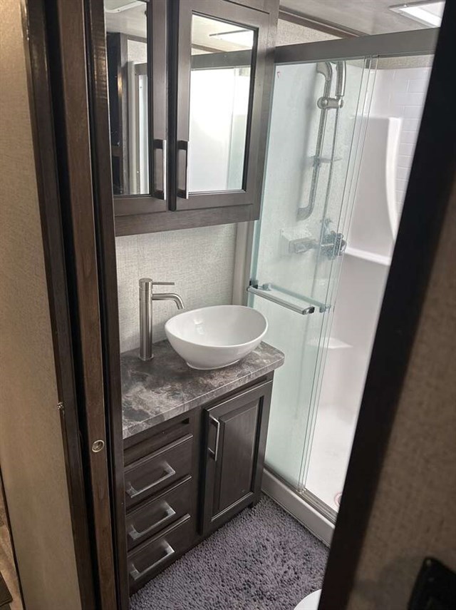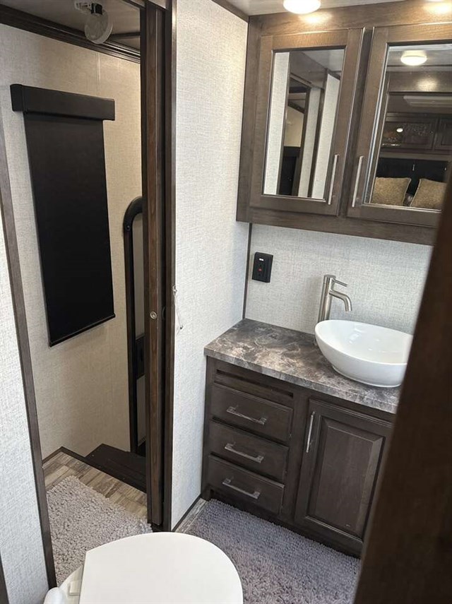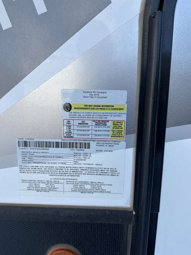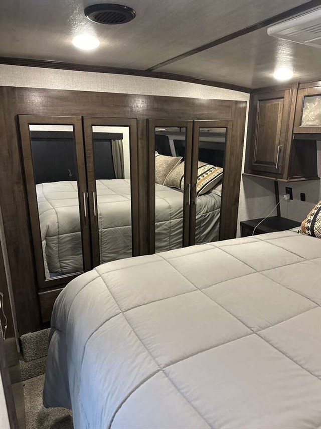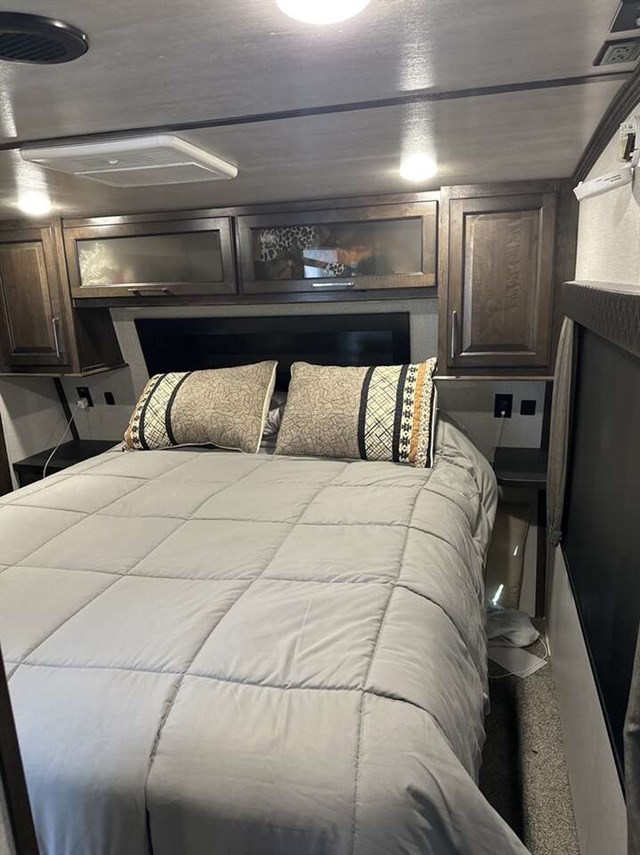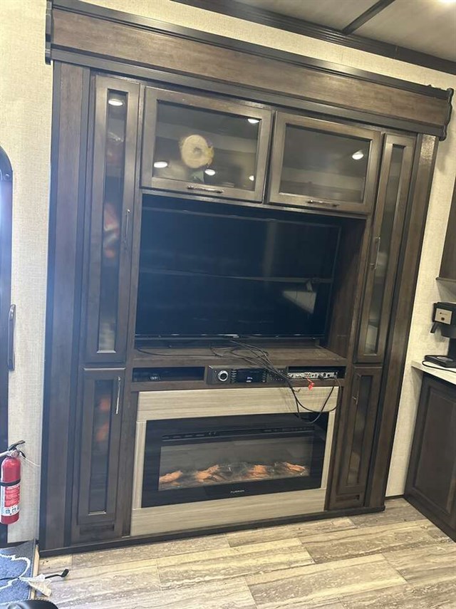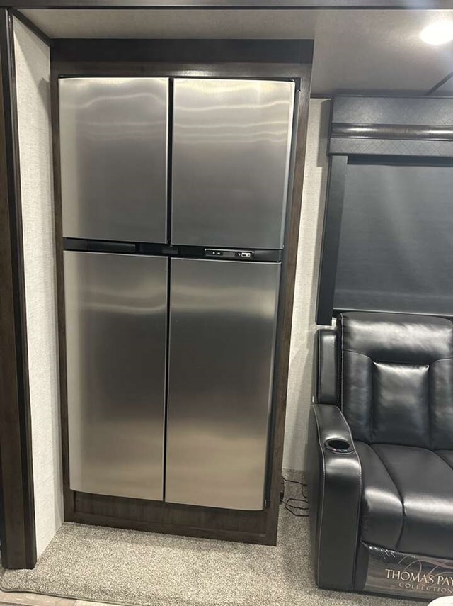 2020 Voltage 4145 triple axle Toy Hauler. This is a very well taken care of, non smoking Toy Hauler, mainly used in a mobile home site, and not used but a few days a year. It has 3 slides, very roomy in the living and kitchen area with seating for 5-6 people, couch with 3 recliners with heat and vibrate, as well as a love seat with 2 recliners with heat an vibrate mode, room for a couple of small bar stools if wanted. It has a 13' garage with 2 beds in the garage area, and can also convert into a dining area, back sliding glass doors with access to a patio area out the back, can sleep up to 7 people with loft area above. The master bedroom has an upgraded very nice queen mattress. Onboard electric start Onan Q5 5500 EVAP generator with a 20 gal fuel tank. Outdoor kitchen area with a stove, fridge and entertainment system. All weather package with heated holding tanks and extra insulation through out ceiling and underbelly. Solar panel on roof keeps batteries charged. 50 amp service with 50' cord, which will run all 3 air conditioners. Automatic electric leveling jacks, 160 gallon fresh water tank, with 88 gallon gray water tank, and 84 gallon black water tank. Full size refrigerator w/freezer. This is a very nice top of the line RV with lots of room.
